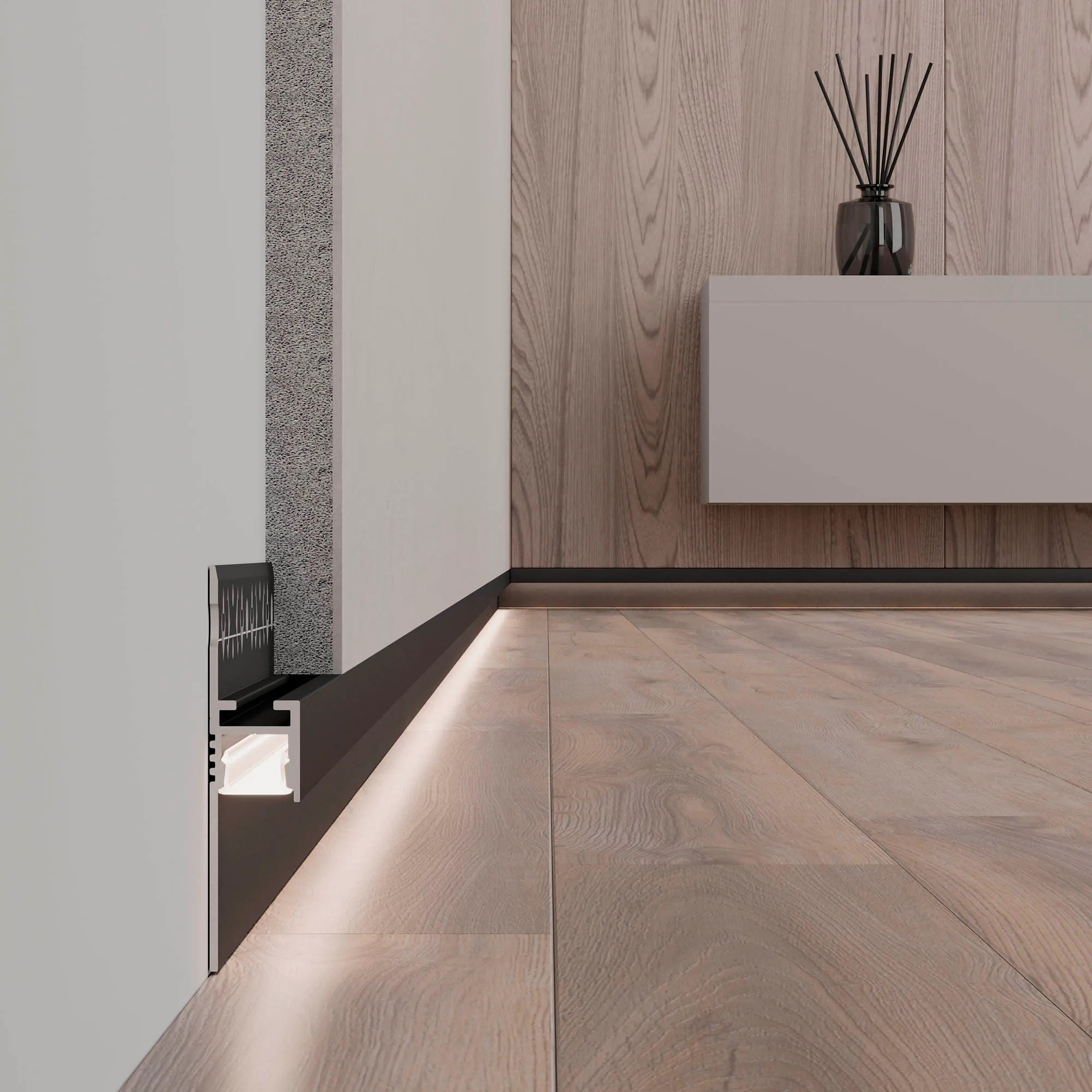 Алюминиевый профиль черного цвета, встраиваемый в гипсокартон, под строительную отделку. Служит как декоративная накладка для подсветки пола и стен, создавая мягкое свечение по периметру помещения, эффект парящей стены или потолка, не является плинтусом.