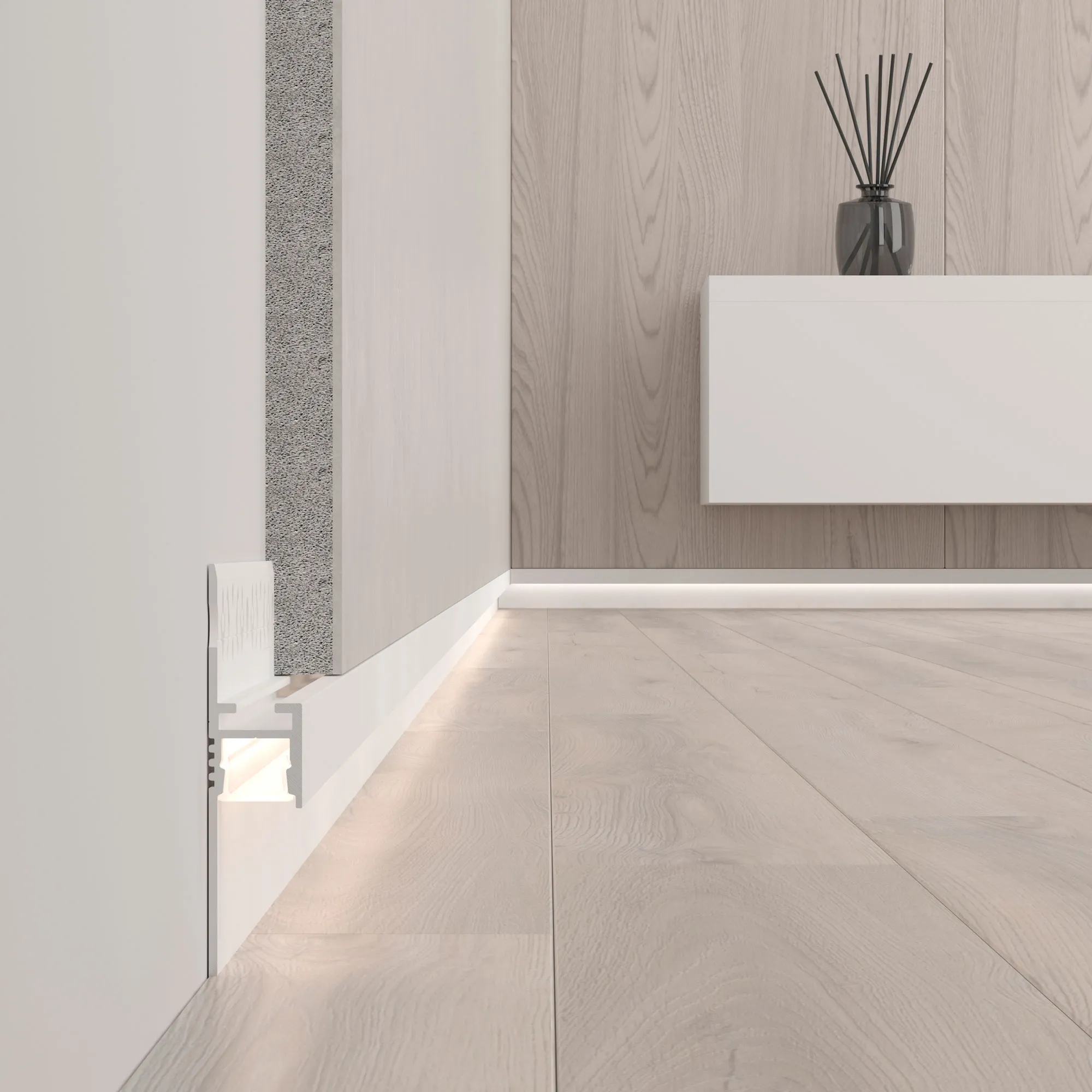 Алюминиевый профиль белого цвета, встраиваемый в гипсокартон, под строительную отделку. Служит как декоративная накладка для подсветки пола и стен, создавая мягкое свечение по периметру помещения, эффект парящей стены или потолка, не является плинтусом.