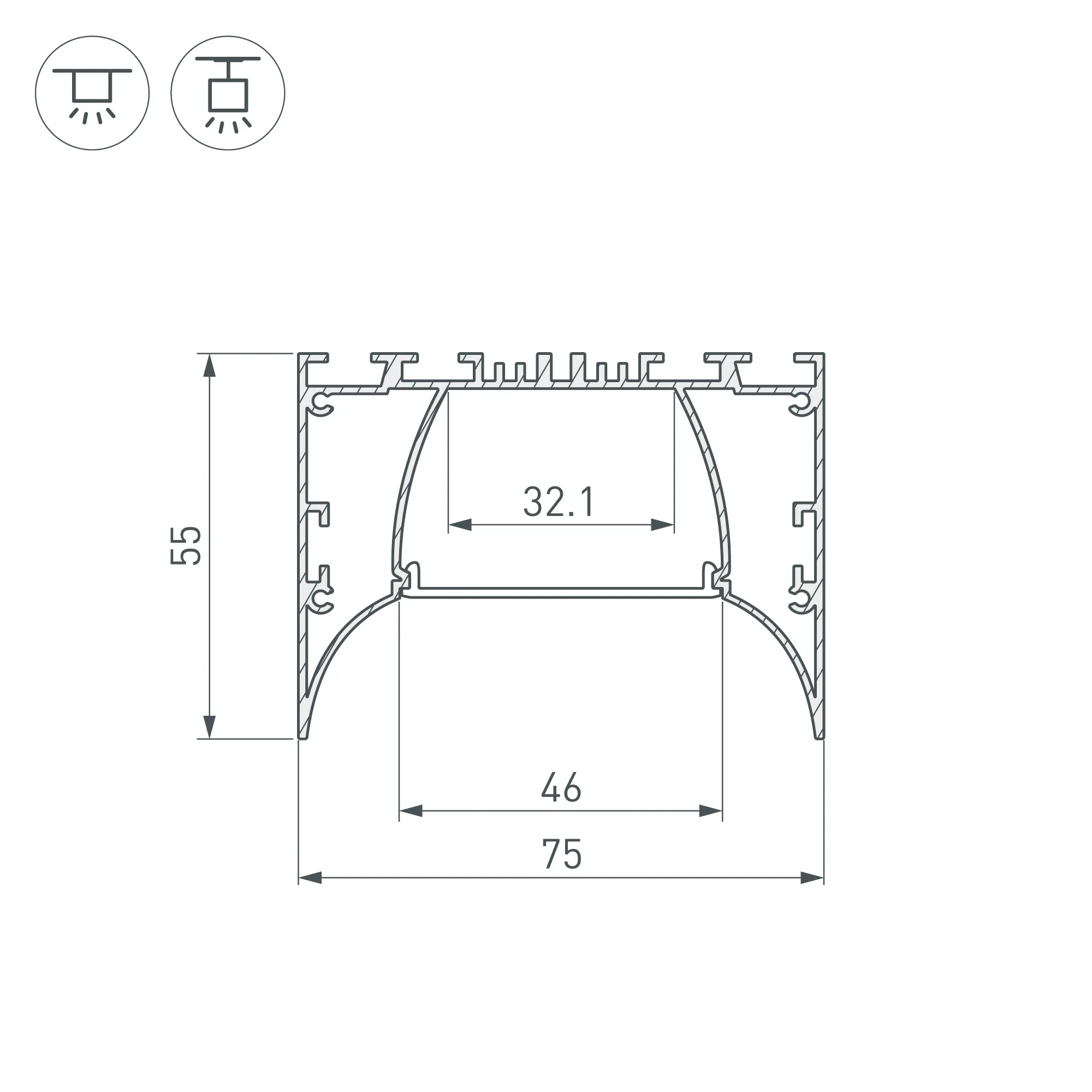 Габаритные размеры профиля составляют 2000 мм в длину, 75 мм в ширину и 55 мм в высоту. Площадка для установки светодиодных лент позволяет использовать ленту шириной до 32 мм и мощностью до 68 Вт/м. Это обеспечивает гибкость в выборе светодиодных лент и создает потрясающие световые решения.