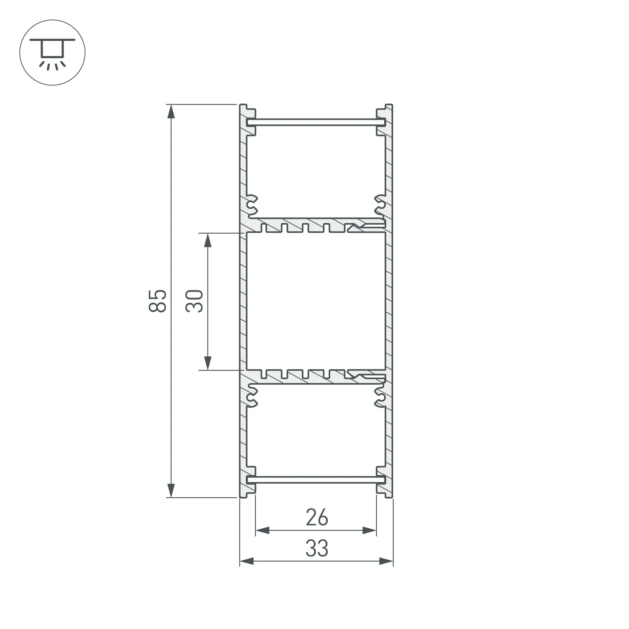 Габаритные размеры профиля составляют 2000 мм в длину, 33 мм в ширину и 85 мм в высоту. Площадки для установки светодиодных лент позволяют использовать ленты шириной до 26 мм и мощностью до 52,7 Вт/м. Это обеспечивает гибкость в выборе светодиодных лент и создает потрясающие световые решения.