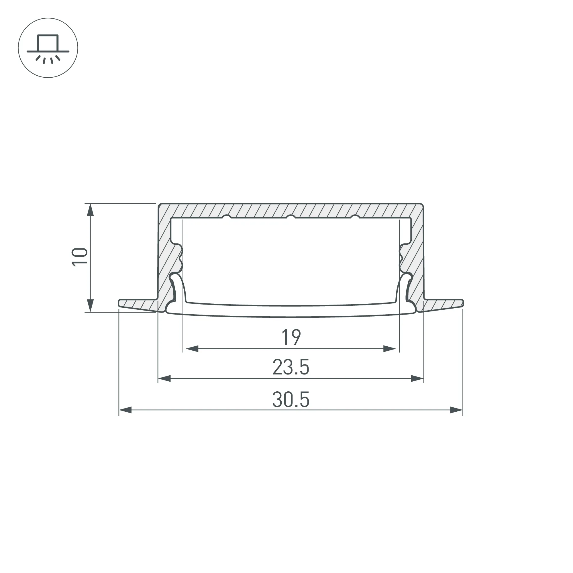 Встраиваемый профиль из анодированного алюминия с накладным фланцем для контурной подсветки элементов интерьера. Габаритные размеры профиля составляют 2000 мм в длину, 30,5 мм в ширину и 10 мм в высоту. Площадка для установки светодиодных лент позволяет использовать ленту шириной до 18 мм и мощностью до 21,2 Вт/м. Это обеспечивает гибкость в выборе светодиодных лент и создает потрясающие световые решения.