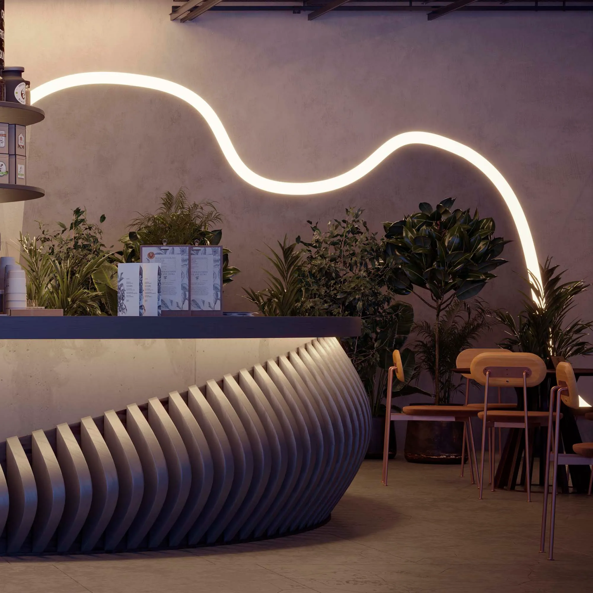 Совместим с прямым алюминиевым профилем FANTOM-W49 и гибким FANTOM-BENT-W49-TOP. Сочетание разных видов профиля поможет подчеркнуть как прямые, так и изогнутые контуры интерьера, а также создать круги и волнообразные линии, переходящие с потолка на стены.