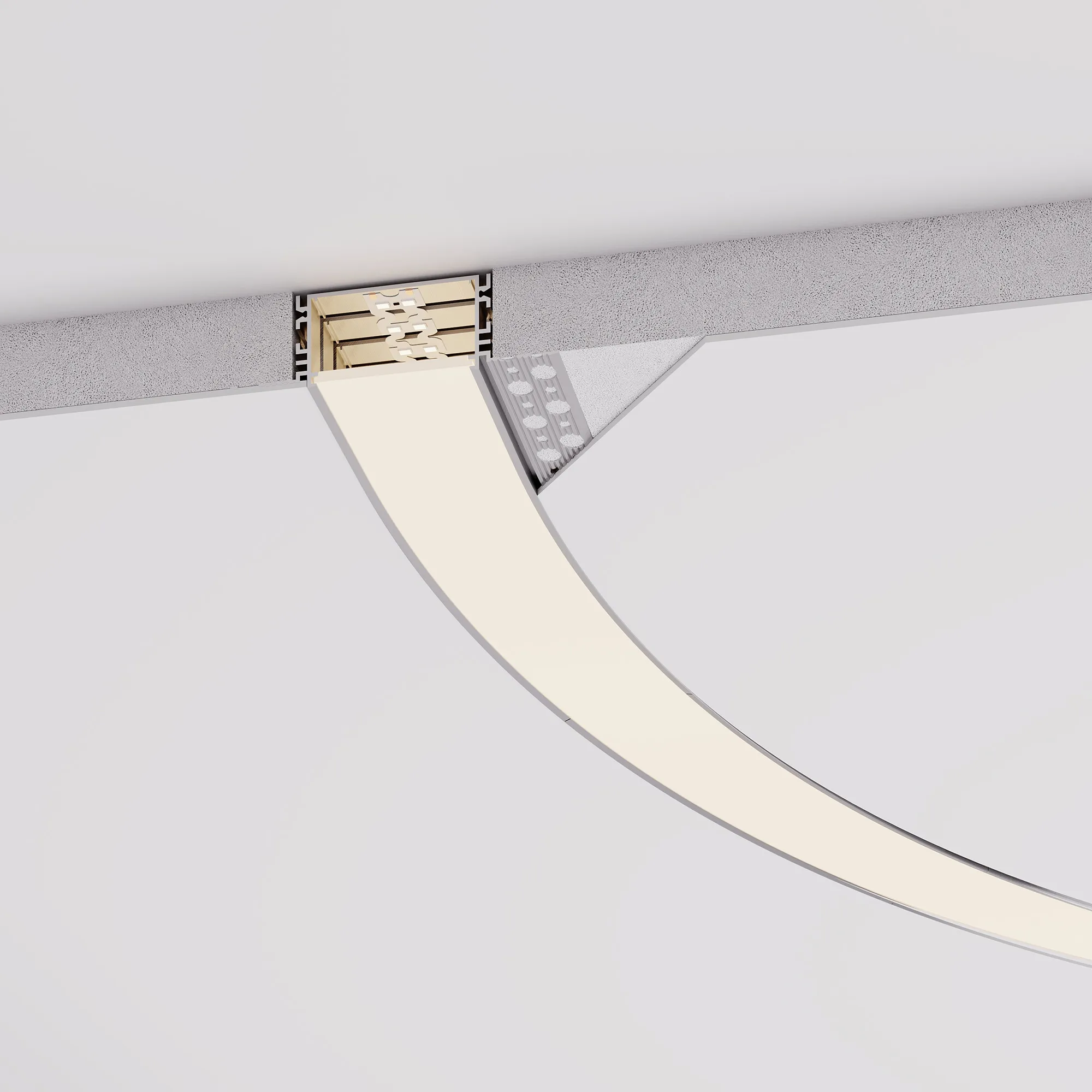 Встраиваемый гибкий профиль из анодированного алюминия со скрытым фланцем под строительную отделку устанавливается в потолки и потолочные ниши из гипсокартона. Минимальный радиус горизонтального изгиба (вправо/влево) 50 см.