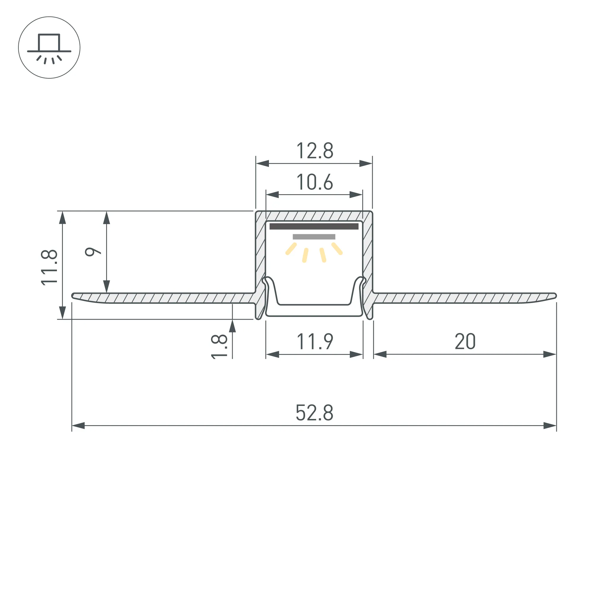 Габаритные размеры профиля составляют 2000 мм в длину, 52,8 мм в ширину и 11,8 мм в высоту. Площадка для установки светодиодных лент позволяет использовать ленту шириной до 10,6 мм и мощностью до 30 Вт/м. Это обеспечивает гибкость в выборе светодиодных лент и создает потрясающие световые решения. Совместим с гибкими алюминиевыми профилями FANTOM-BENT-W12-TOP и FANTOM-BENT-W12-SIDE. Сочетание разных видов профиля поможет подчеркнуть как прямые, так и изогнутые контуры интерьера, а также создать круги и волнообразные линии, переходящие с потолка на стены.