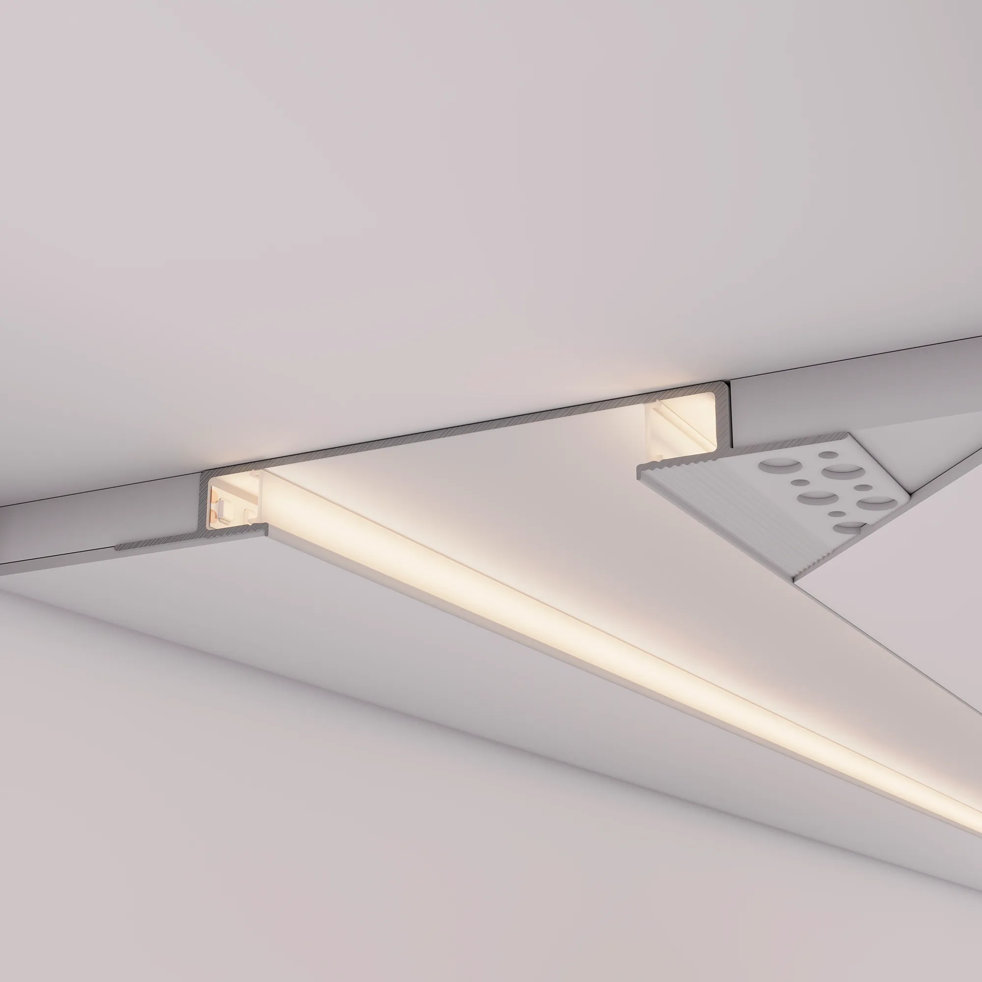 Встраиваемый алюминиевый профиль со скрытым фланцем под строительную отделку белого цвета с двусторонним свечением с эффектом «объемного света» для основного освещения и контурной подсветки.