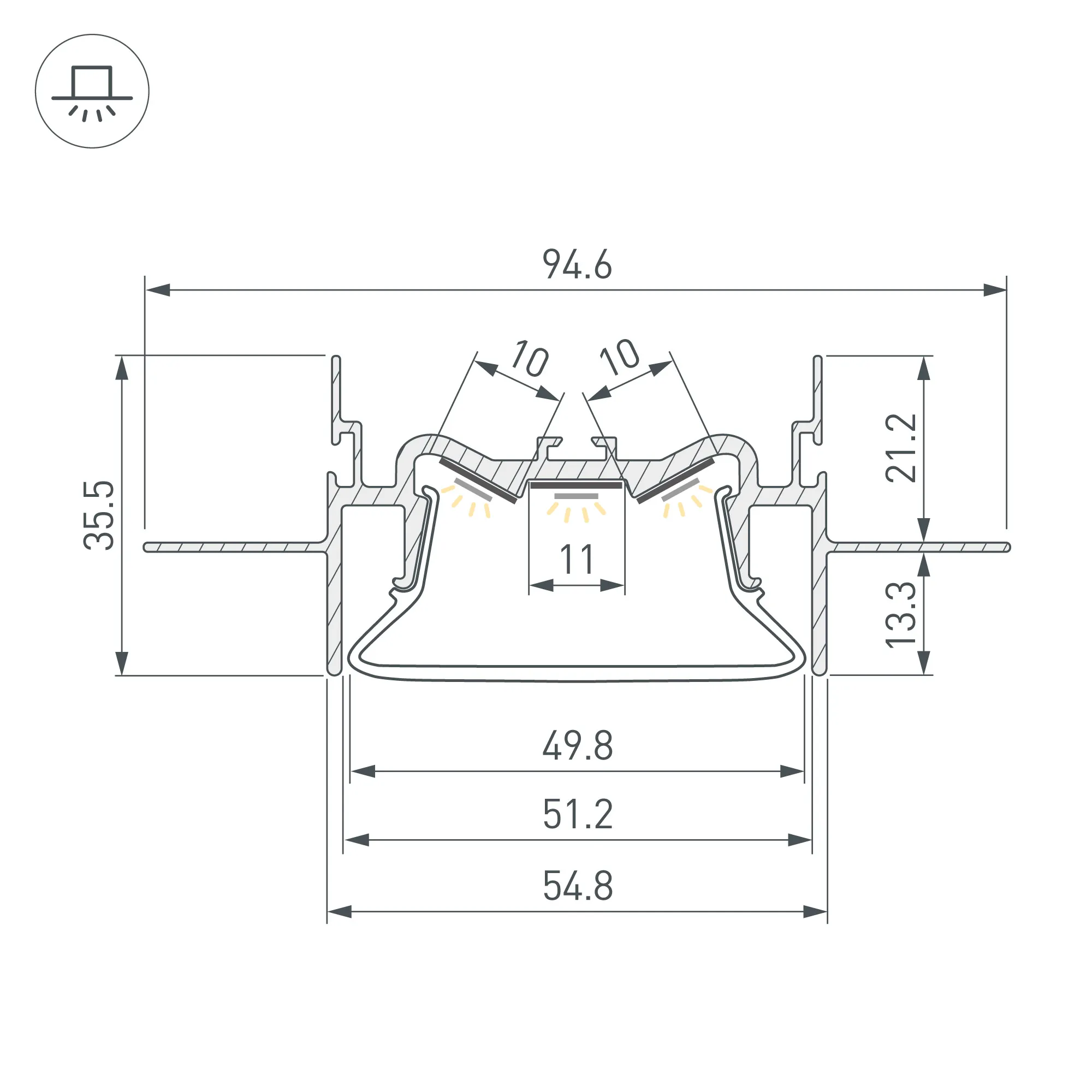 Габаритные размеры профиля составляют 2000 мм в длину, 95 мм в ширину и 36 мм в высоту. Площадки для установки светодиодных лент позволяют использовать ленты шириной до 10 мм и мощностью до 50 Вт/м (общая мощность для трех лент). Это обеспечивает гибкость в выборе светодиодных лент и создает потрясающие световые решения.
