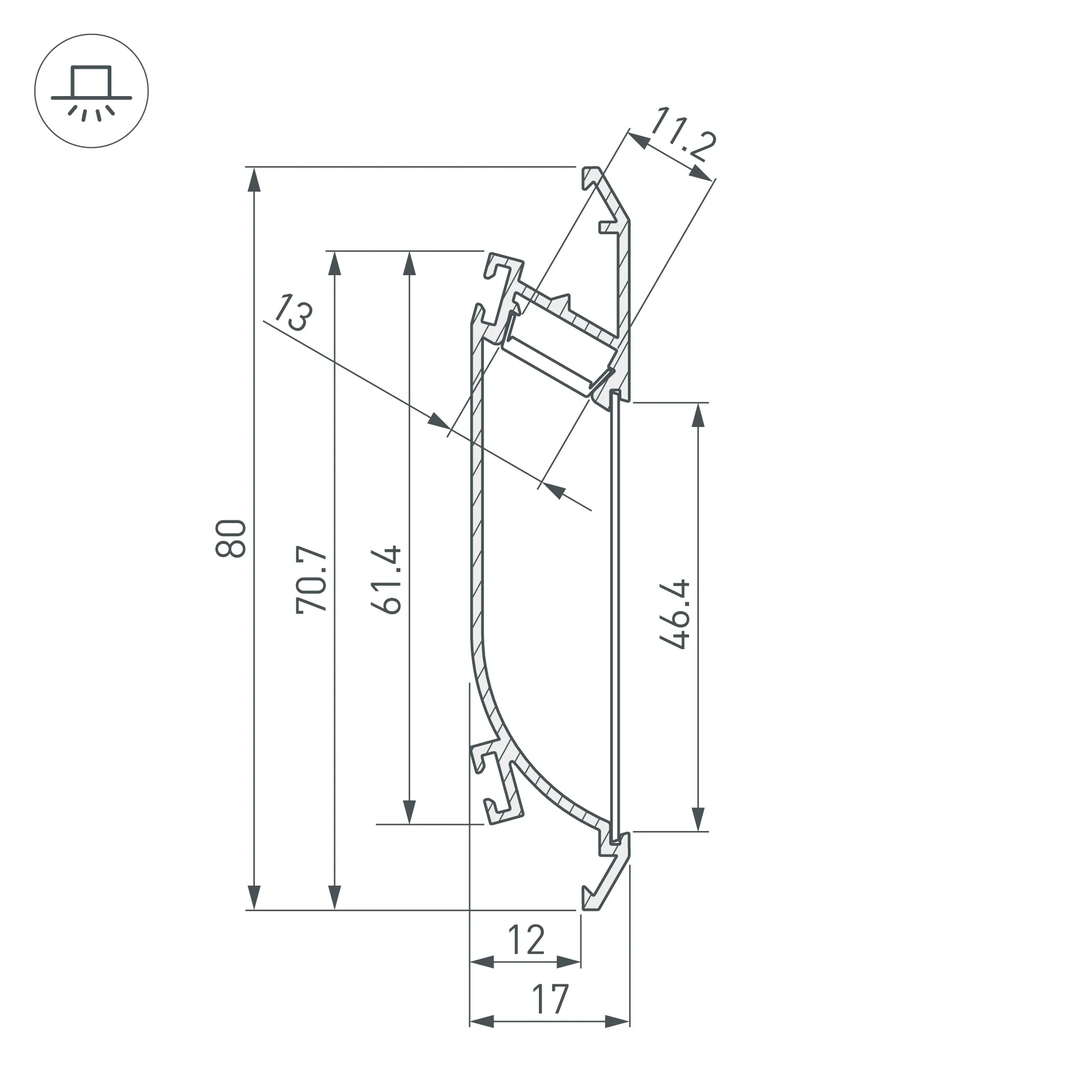 Встраиваемый профиль с накладным фланцем из анодированного алюминия для подсветки стен. Подходит для гипсокартона толщиной 12мм. Габаритные размеры профиля составляют 2000 мм в длину, 17 мм в ширину и 80 мм в высоту. Площадка для установки светодиодных лент позволяет использовать ленту шириной до 11,2 мм и мощностью до 48,3 Вт/м. Это обеспечивает гибкость в выборе светодиодных лент и создает потрясающие световые решения.