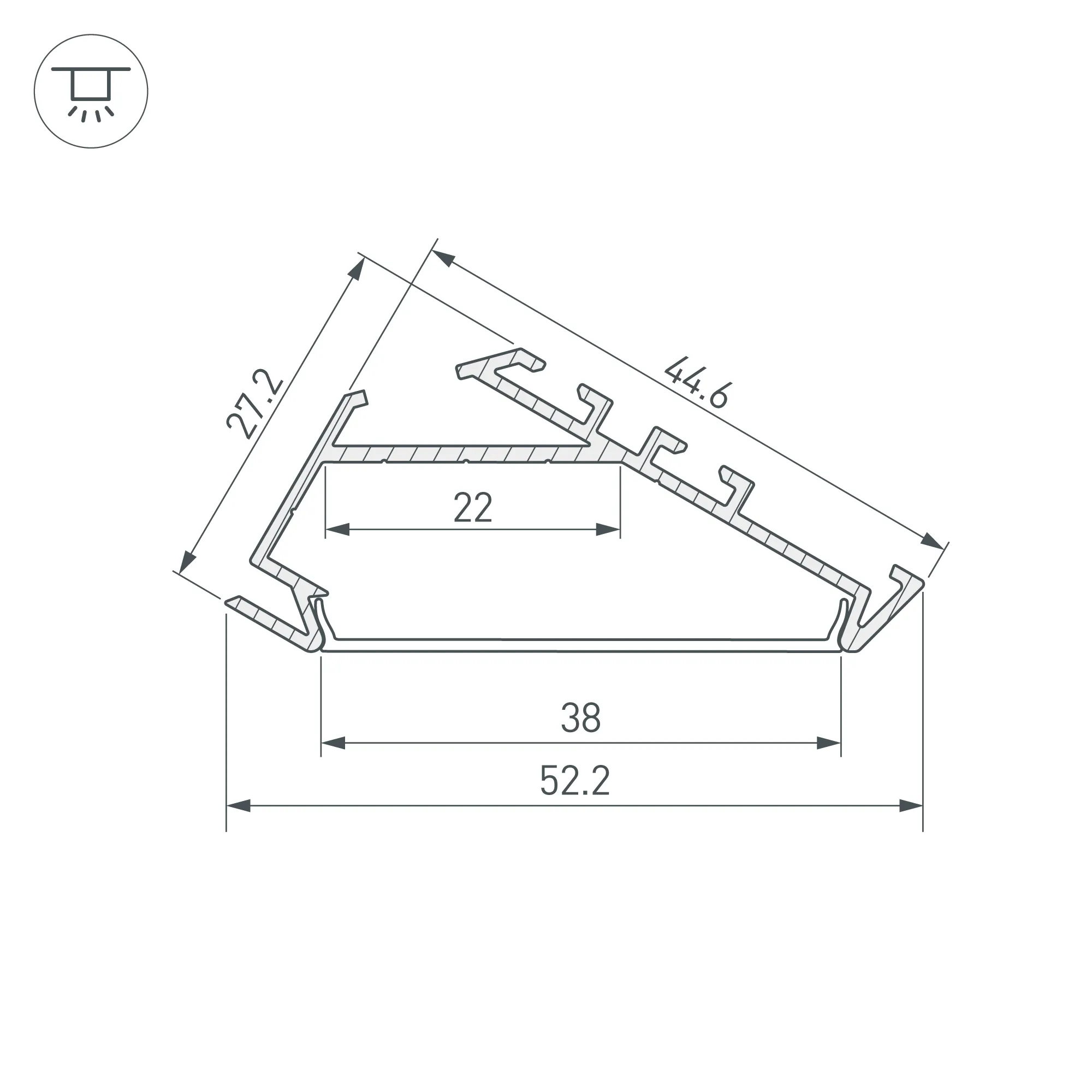 Угловой профиль (угол свечения 30°) из анодированного алюминия для подсветки мебели, ниш и других элементов интерьера. Усеченный угол профиля позволяет достичь высокой точности установки при любых неровностях. Габаритные размеры профиля составляют 2000 мм в длину, 44,6 мм в ширину и 27,2 мм в высоту. Площадка для установки светодиодных лент позволяет использовать ленту шириной до 22 мм и мощностью до 31,4 Вт/м. Это обеспечивает гибкость в выборе светодиодных лент и создает потрясающие световые решения.
