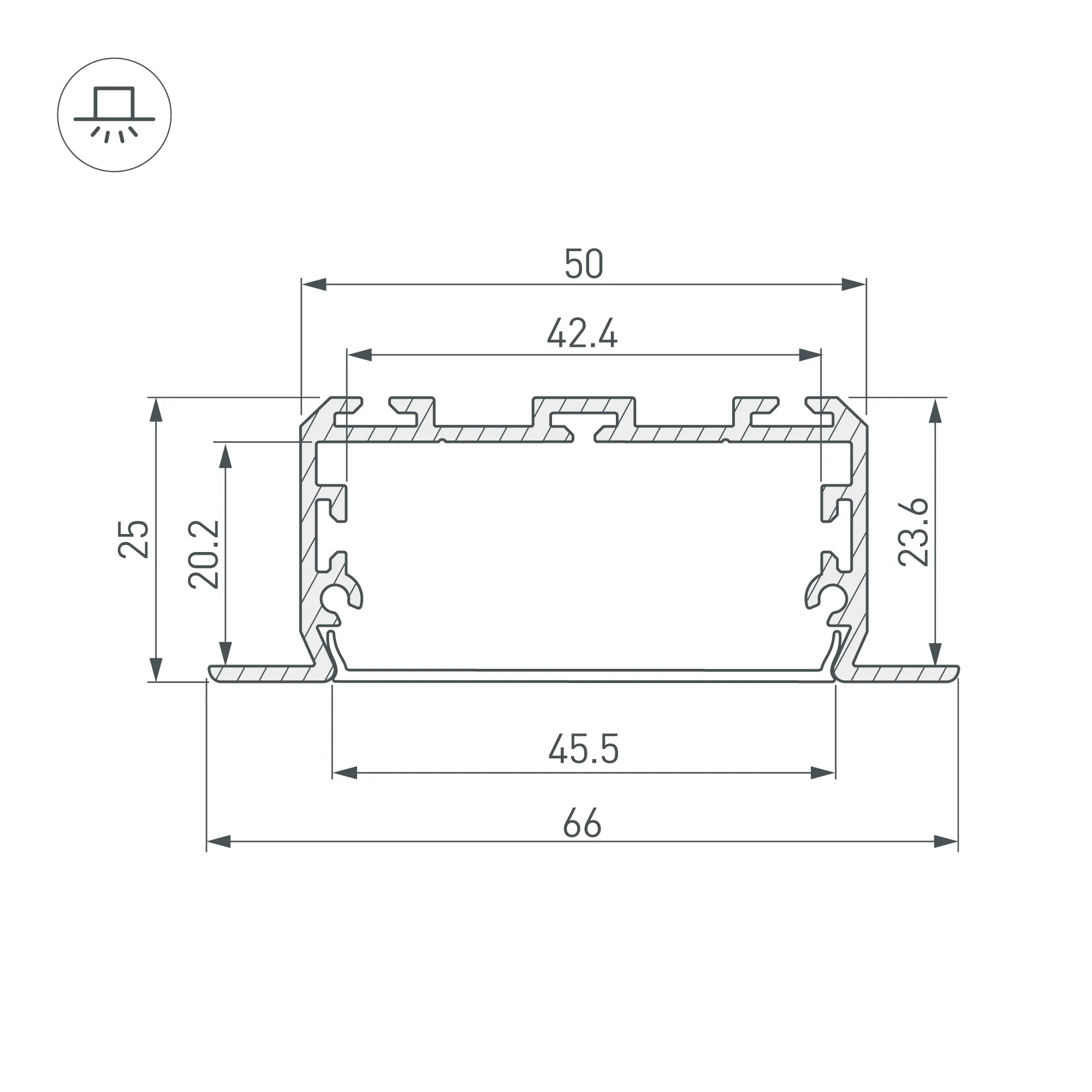 Габаритные размеры профиля составляют 2000 мм в длину, 66 мм в ширину и 25 мм в высоту. Площадка для установки светодиодных лент позволяет использовать ленту шириной до 48 мм и мощностью до 43,3 Вт/м. Это обеспечивает гибкость в выборе светодиодных лент и создает потрясающие световые решения.