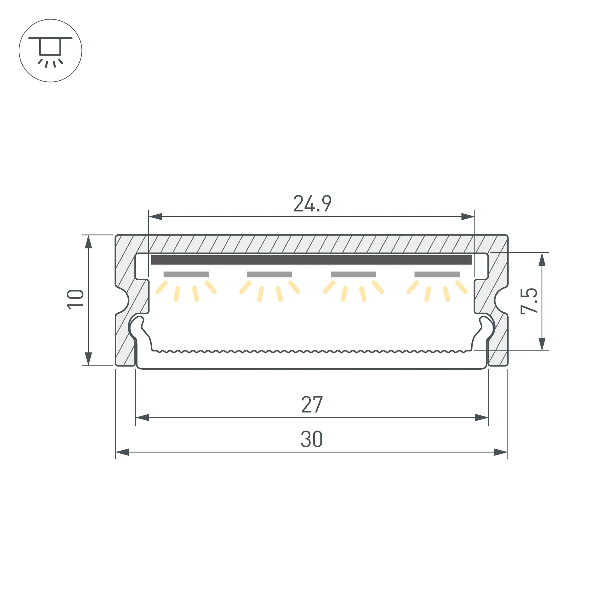 Накладной профиль из анодированного алюминия для контурной или основной подсветки. Габаритные размеры профиля составляют 2000 мм в длину, 30 мм в ширину и 10 мм в высоту. Площадка для установки светодиодных лент позволяет использовать ленту шириной до 24 мм и мощностью до 21 Вт/м. Это обеспечивает гибкость в выборе светодиодных лент и создает потрясающие световые решения.