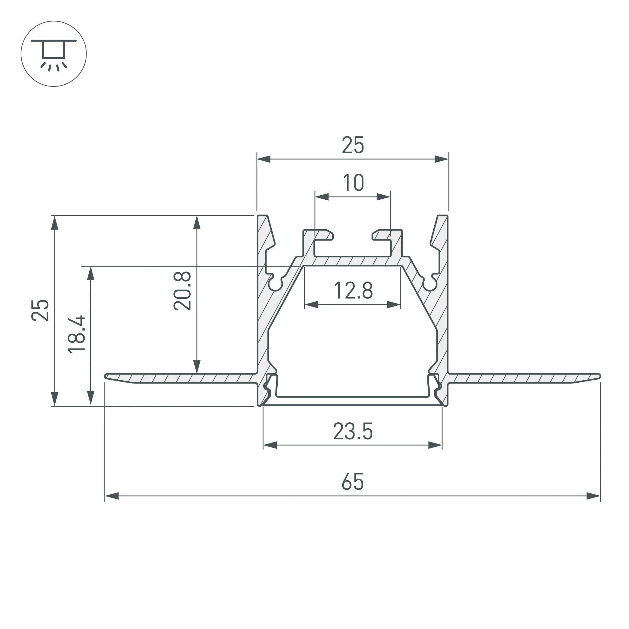 Встраиваемый профиль со скрытым фланцем под строительную отделку из анодированного алюминия серебристого цвета для основной и контурной подсветки помещений. Габаритные размеры профиля составляют 2000 мм в длину, 65 мм в ширину и 25 мм в высоту. Паз для установки 25 мм. Площадка для установки светодиодных лент позволяет использовать ленту шириной до 12,8 мм и мощностью до 36,9 Вт/м. Это обеспечивает гибкость в выборе светодиодных лент и создает потрясающие световые решения.
