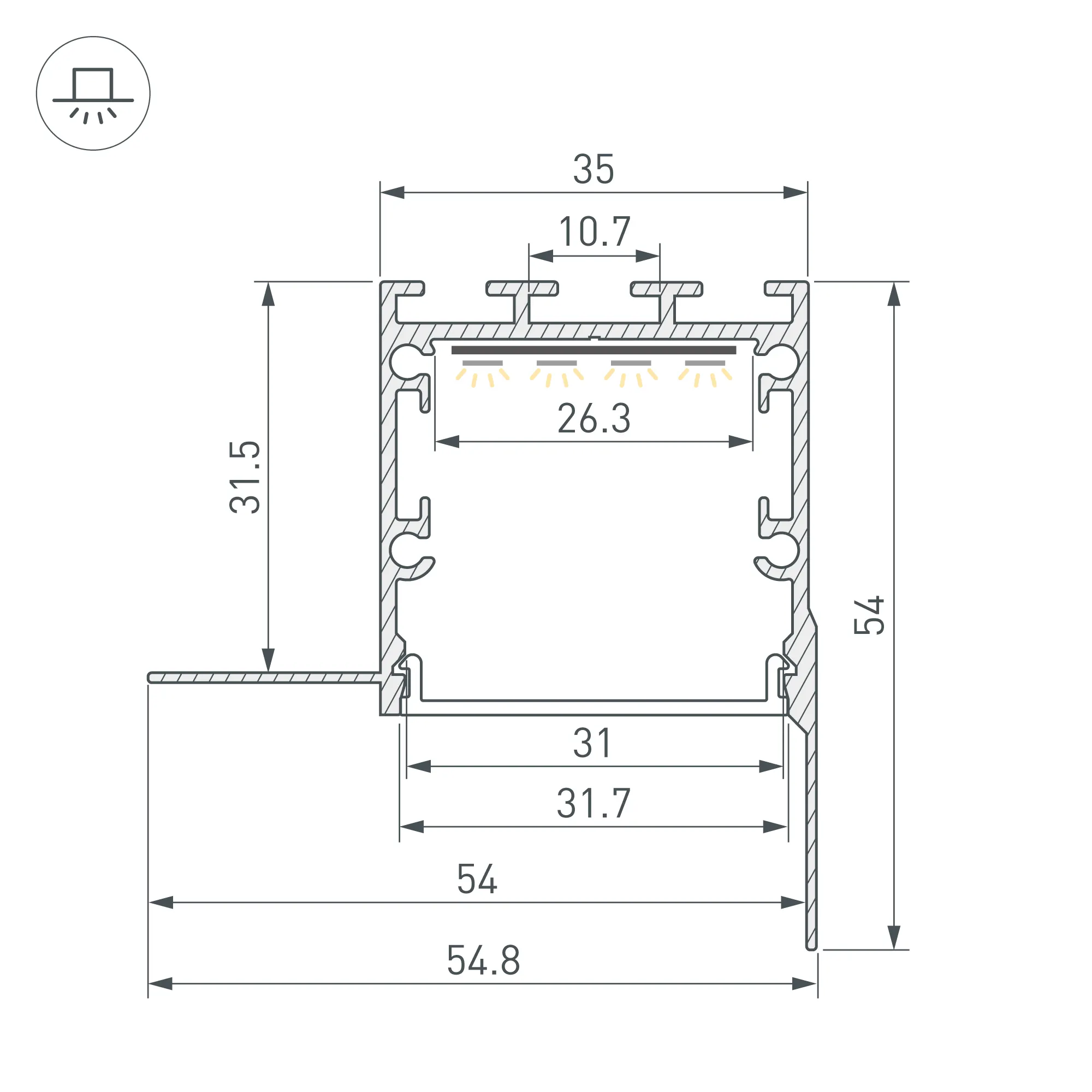 Габаритные размеры профиля составляют 2000 мм в длину, 54,8 мм в ширину и 54 мм в высоту. Площадка для установки светодиодных лент позволяет использовать ленту шириной до 26 мм и мощностью до 46 Вт/м. Это обеспечивает гибкость в выборе светодиодных лент и создает потрясающие световые решения.