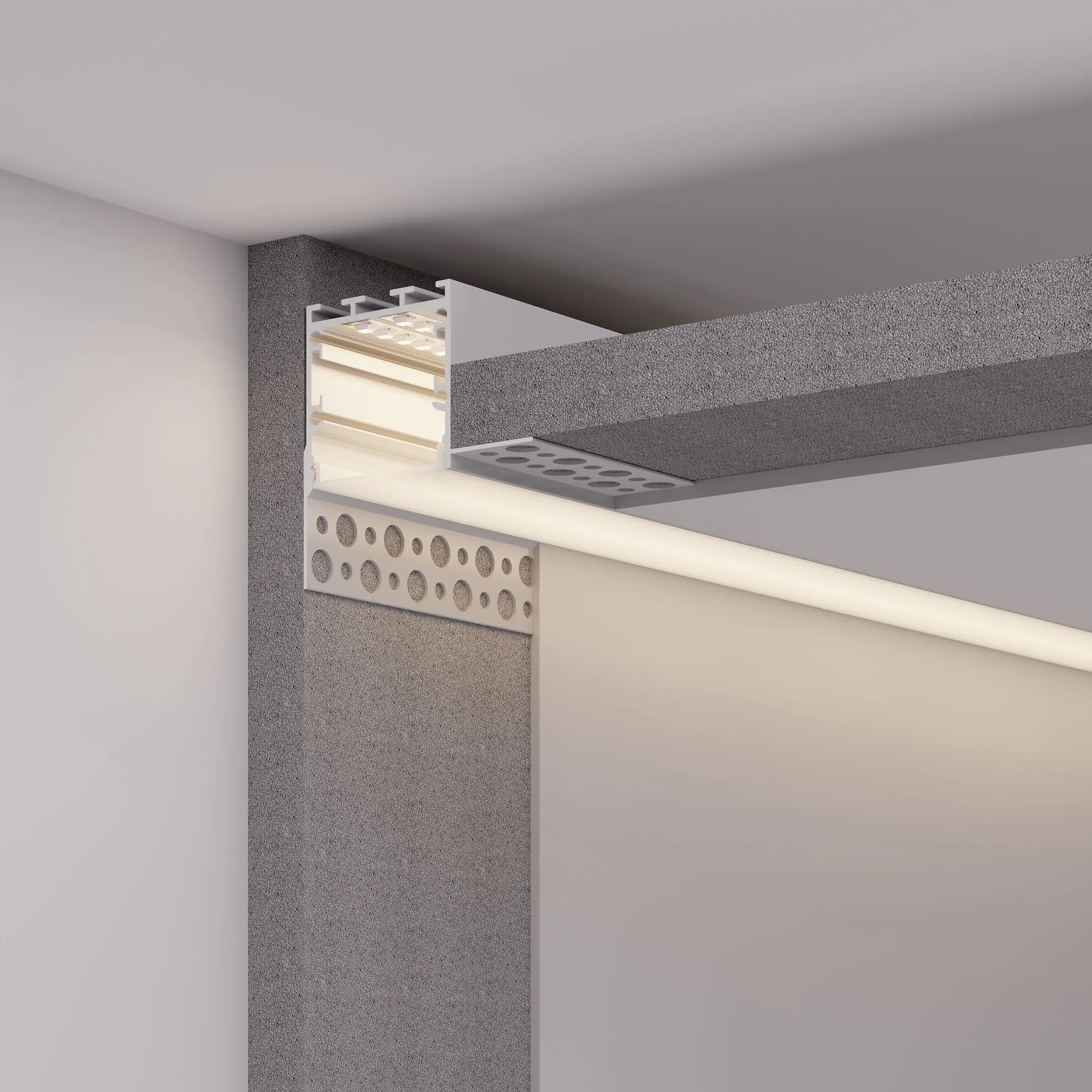 Встраиваемый профиль из анодированного алюминия со скрытым фланцем под строительную отделку устанавливается в потолки и потолочные ниши из гипсокартона для контурной подсветки помещений.