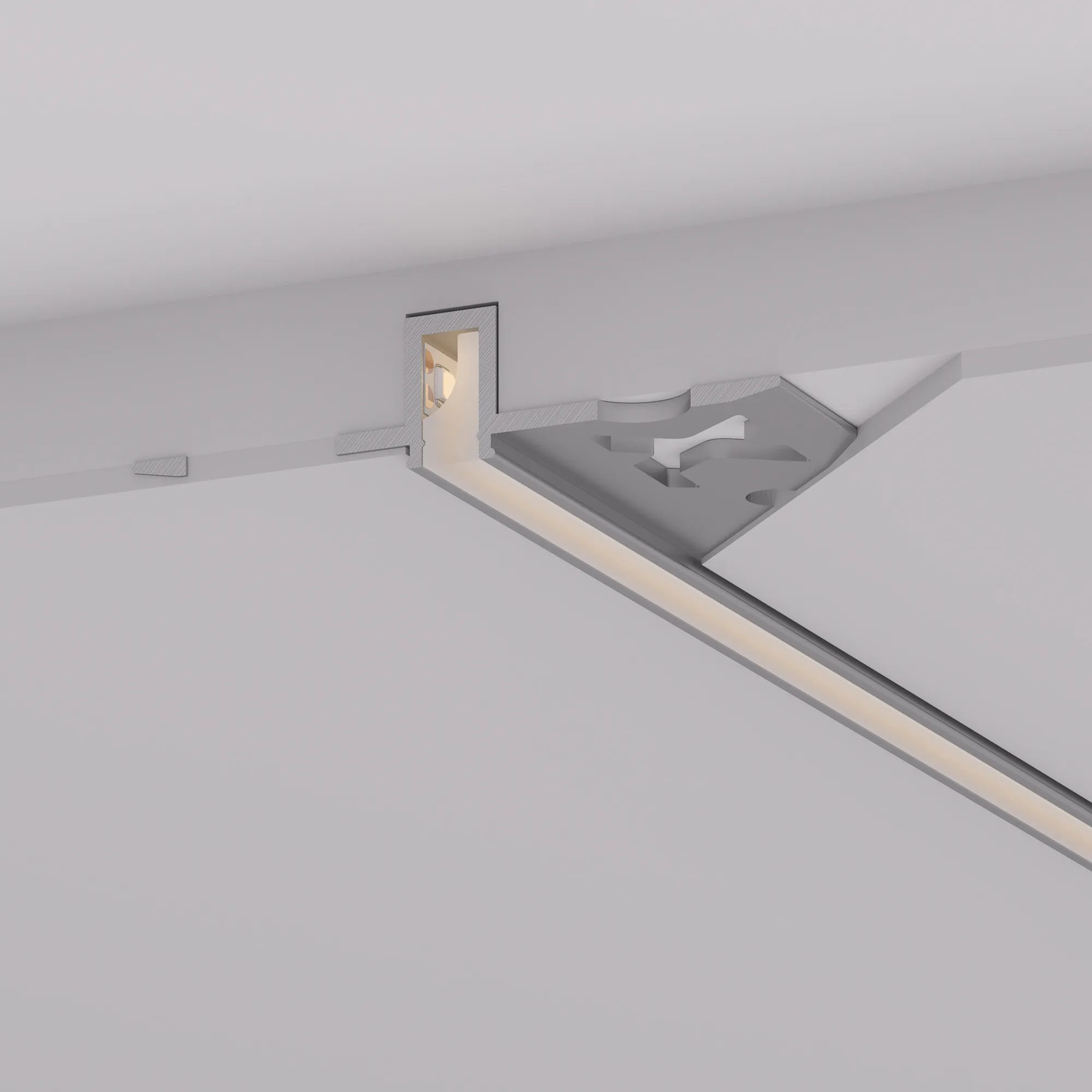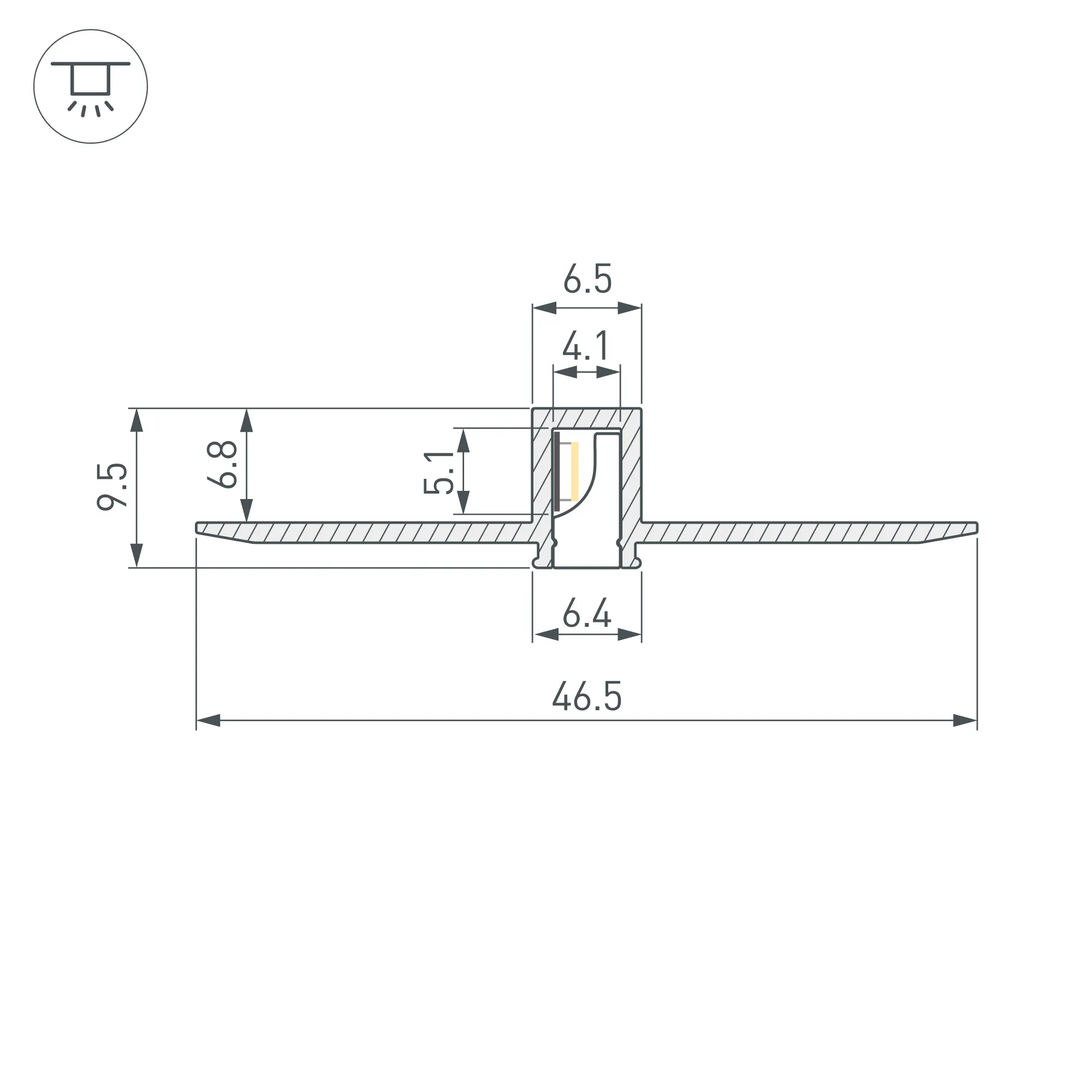 Встраиваемый профиль со скрытым фланцем из анодированного алюминия под строительную отделку для контурной подсветки интерьера. Габаритные размеры профиля составляют 2000 мм в длину, 46,5 мм в ширину и 9,5 мм в высоту. Площадка для установки светодиодных лент позволяет использовать ленту шириной до 5 мм и мощностью до 17,5 Вт/м. Это обеспечивает гибкость в выборе светодиодных лент и создает потрясающие световые решения.