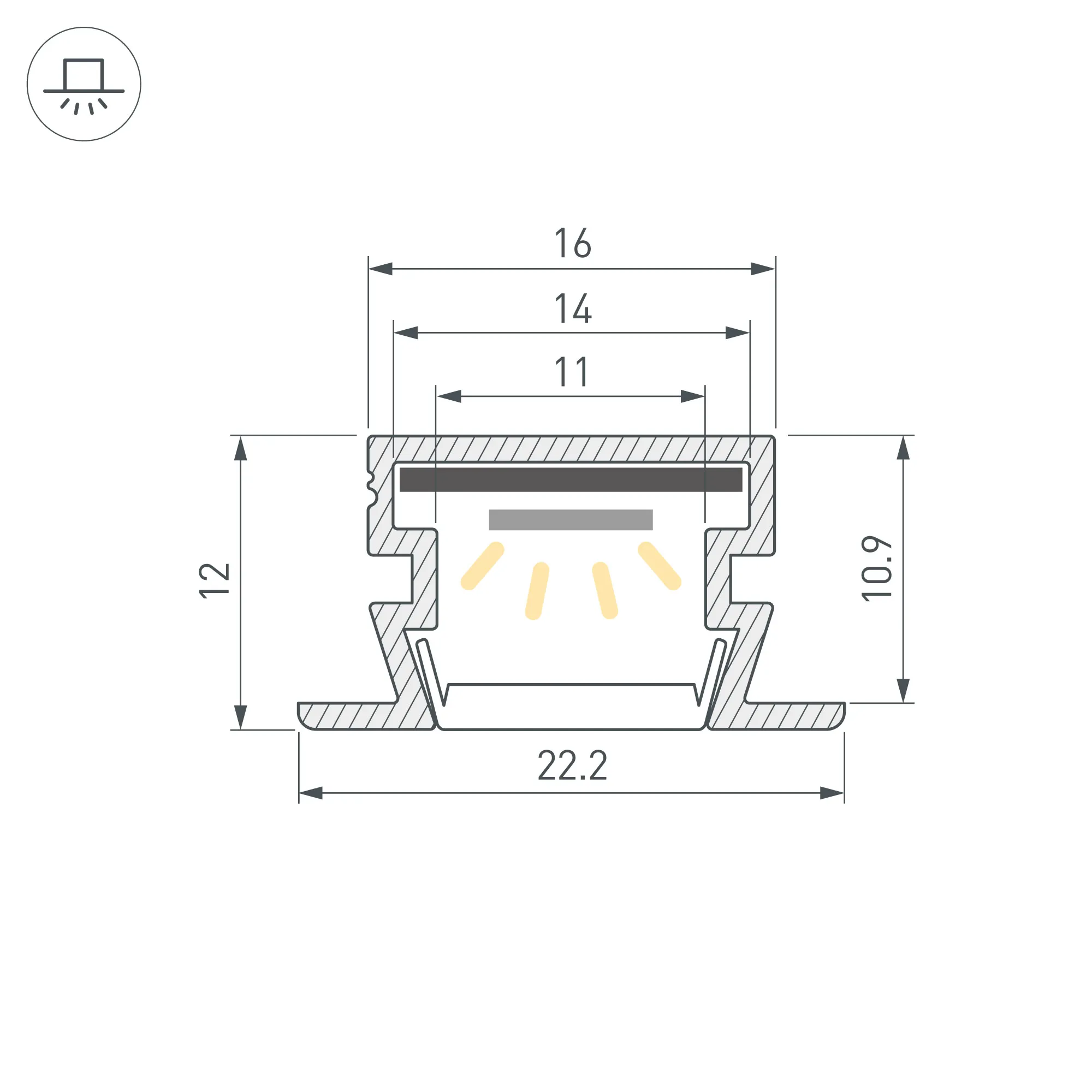 Габаритные размеры профиля составляют 2000 мм в длину, 22,2 мм в ширину и 12 мм в высоту. Площадка для установки светодиодных лент позволяет использовать ленту шириной до 14 мм и мощностью до 16,4 Вт/м. Это обеспечивает гибкость в выборе светодиодных лент и создает потрясающие световые решения.