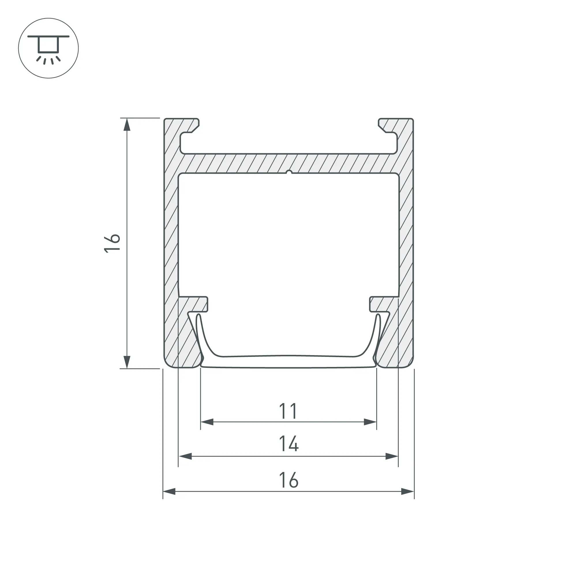 Накладной профиль из анодированного алюминия со скрытым монтажом на скобы для контурной подсветки. Габаритные размеры профиля составляют 2000 мм в длину, 16 мм в ширину и 16 мм в высоту. Площадка для установки светодиодных лент позволяет использовать ленту шириной до 14 мм и мощностью до 17 Вт/м. Это обеспечивает гибкость в выборе светодиодных лент и создает потрясающие световые решения.