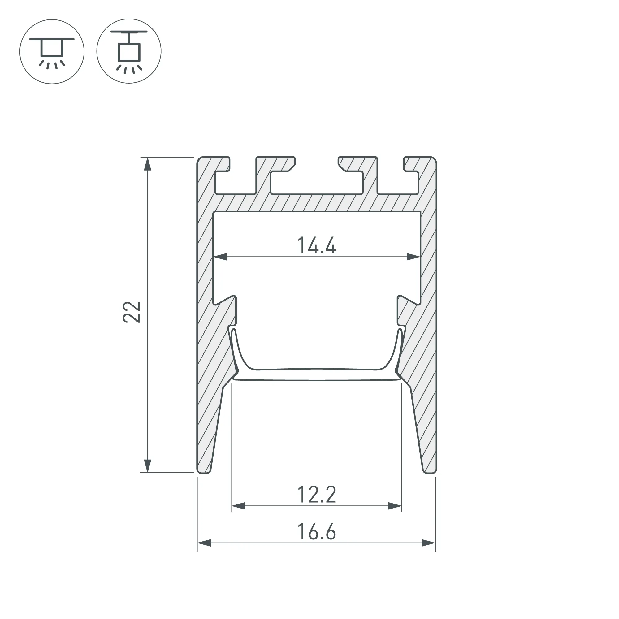 Подвесной/накладной профиль черного цвета из анодированного алюминия для основного освещения и контурной подсветки интерьера. Экран утоплен в плоскости профиля, что позволяет скрыть источник света от прямого контакта с глазами. Габаритные размеры профиля составляют 2000 мм в длину, 16,6 мм в ширину и 22 мм в высоту. Площадка для установки светодиодных лент позволяет использовать ленту шириной до 14,4 мм и мощностью до 20 Вт/м. Это обеспечивает гибкость в выборе светодиодных лент и создает потрясающие световые решения.