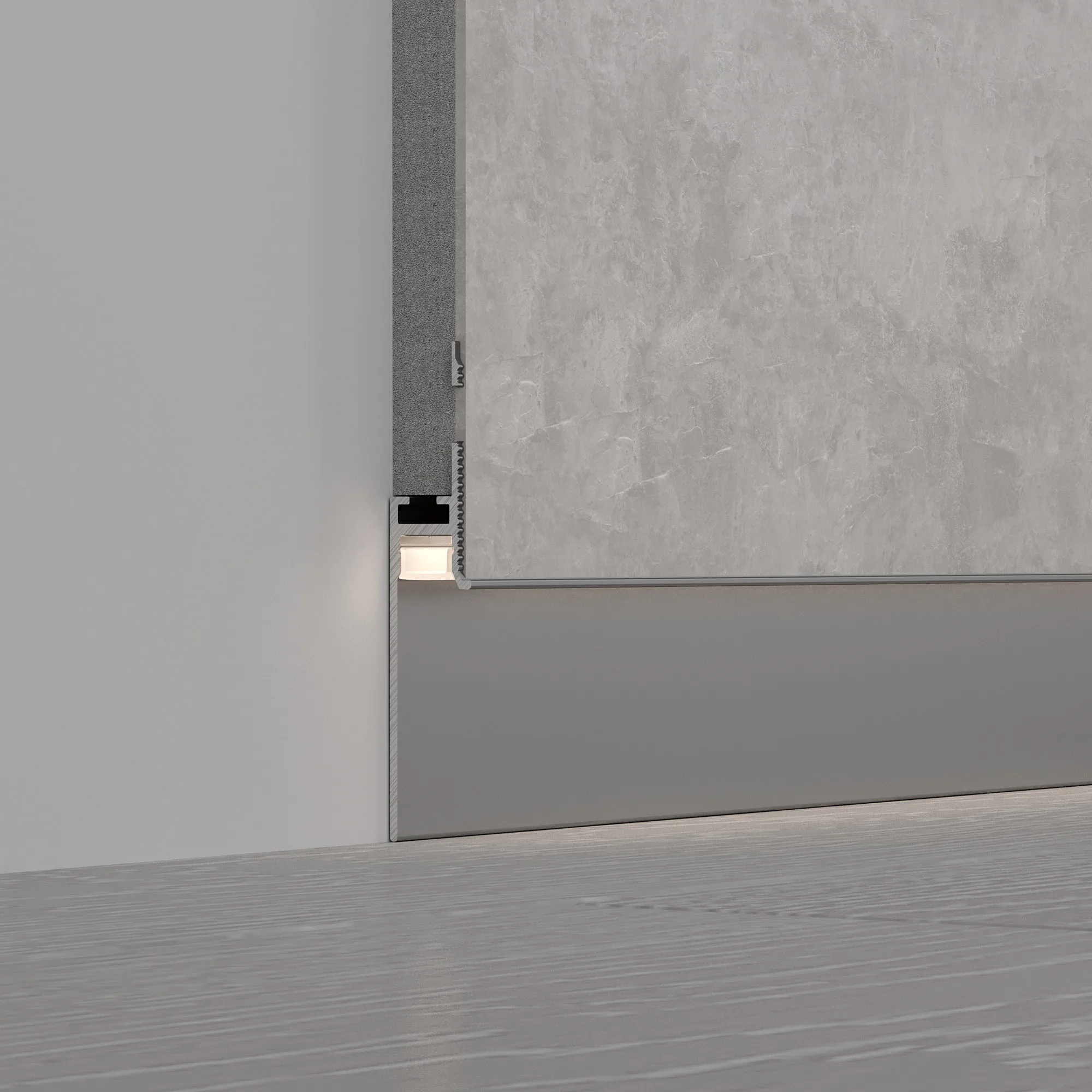 Встраиваемый профиль из анодированного алюминия для светодиодных лент и линеек под строительную отделку для создания эффекта парящей стены. Не является плинтусом, используется как декоративная накладка на фальш-стены.
