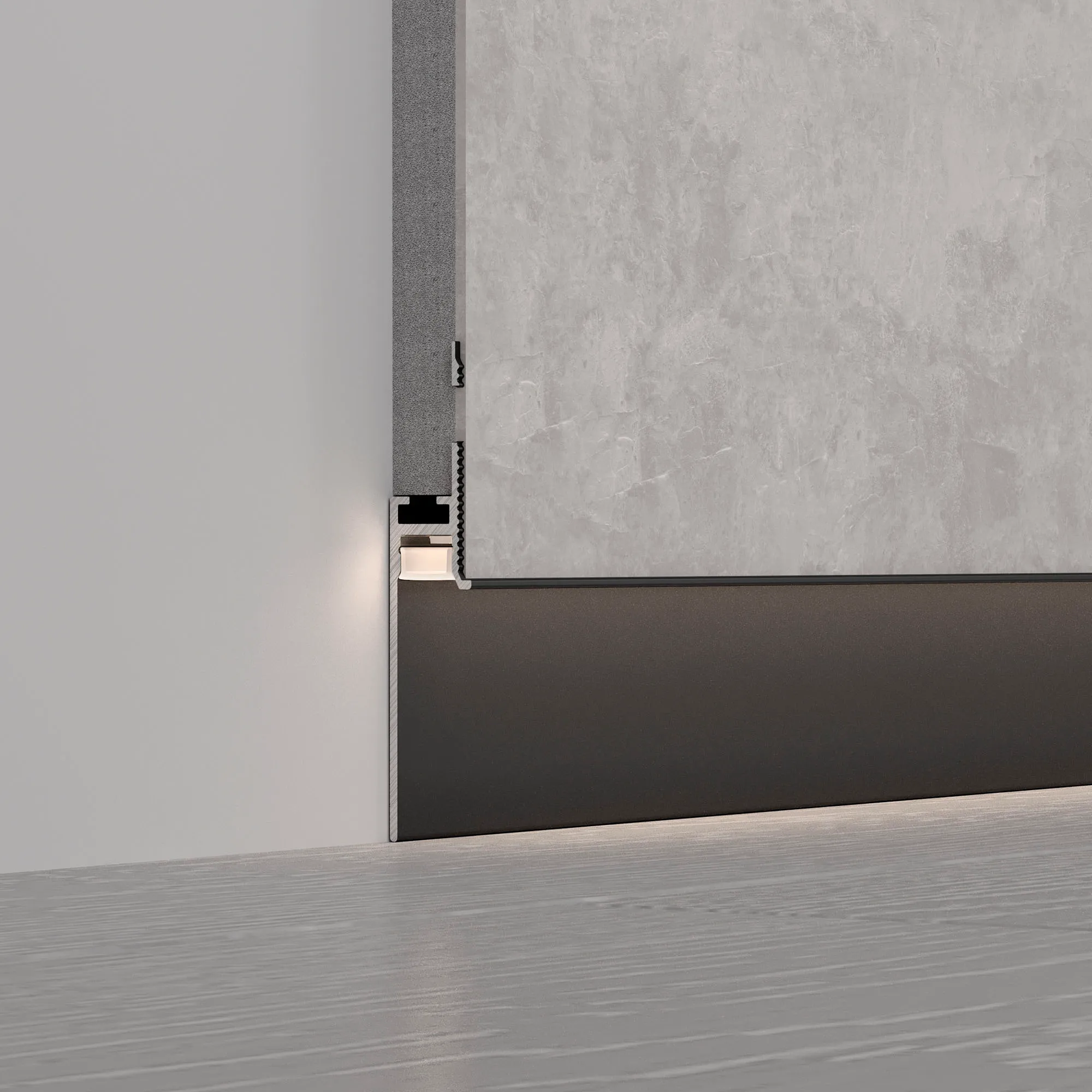 Встраиваемый алюминиевый профиль черного цвета для светодиодных лент и линеек под строительную отделку для создания эффекта парящей стены. Не является плинтусом, используется как декоративная накладка на фальш-стены.