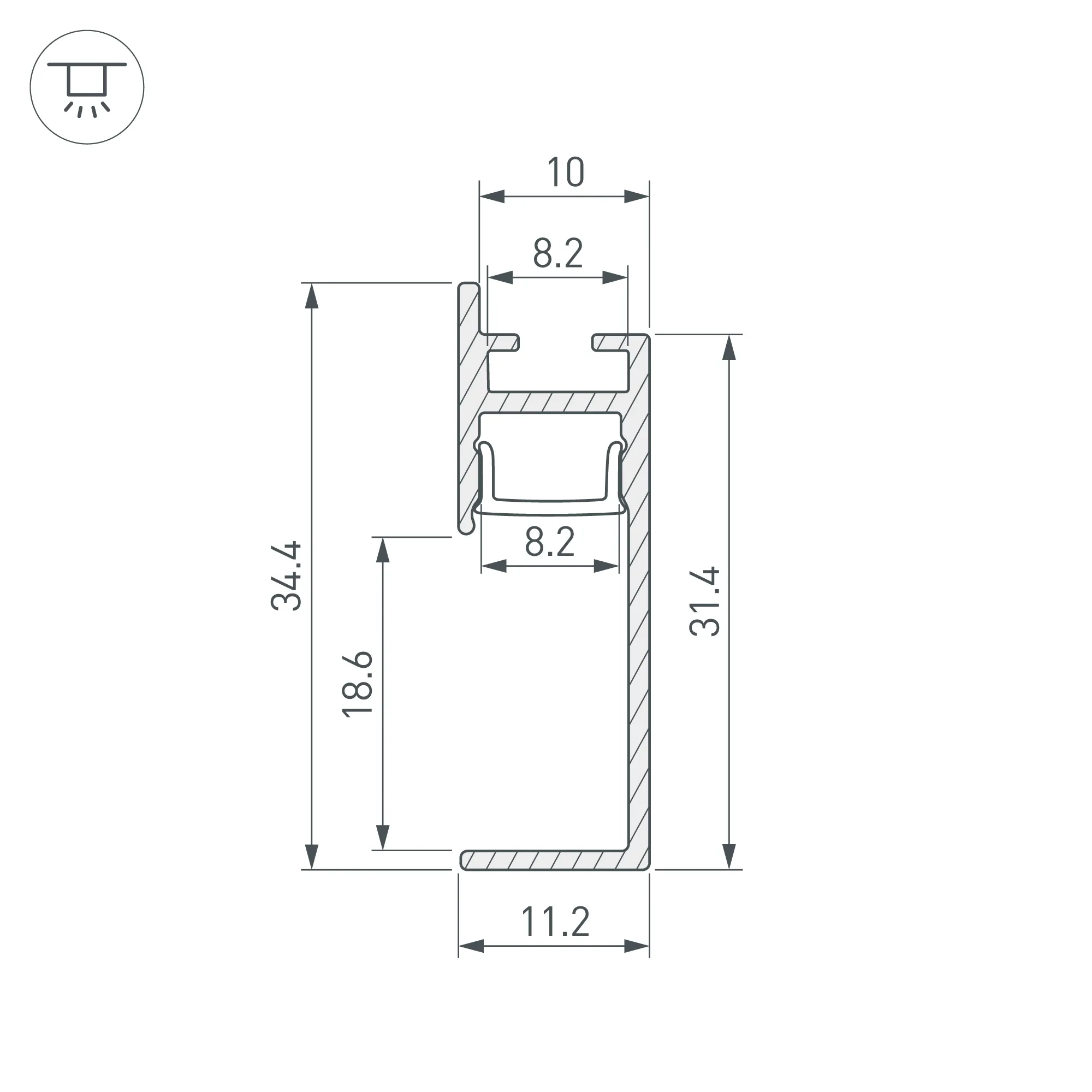 Габаритные размеры профиля составляют 2000 мм в длину, 11,2 мм в ширину и 34,4 мм в высоту. Площадка для установки светодиодных лент позволяет использовать ленту шириной до 8 мм и мощностью до 18 Вт/м. Это обеспечивает гибкость в выборе светодиодных лент и создает потрясающие световые решения.