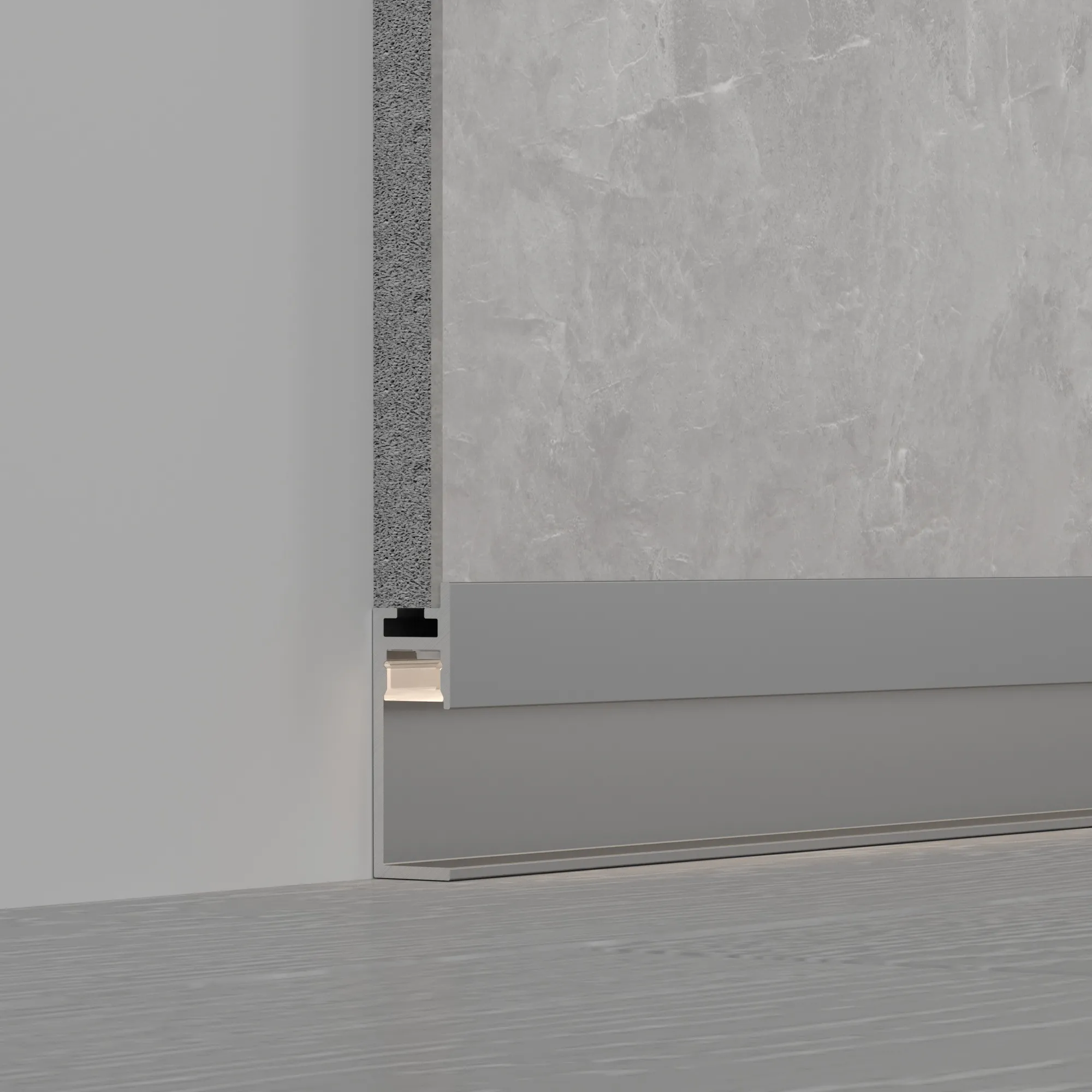 Встраиваемый профиль-плинтус из анодированного алюминия с накладным фланцем для создания эффекта парящей стены.