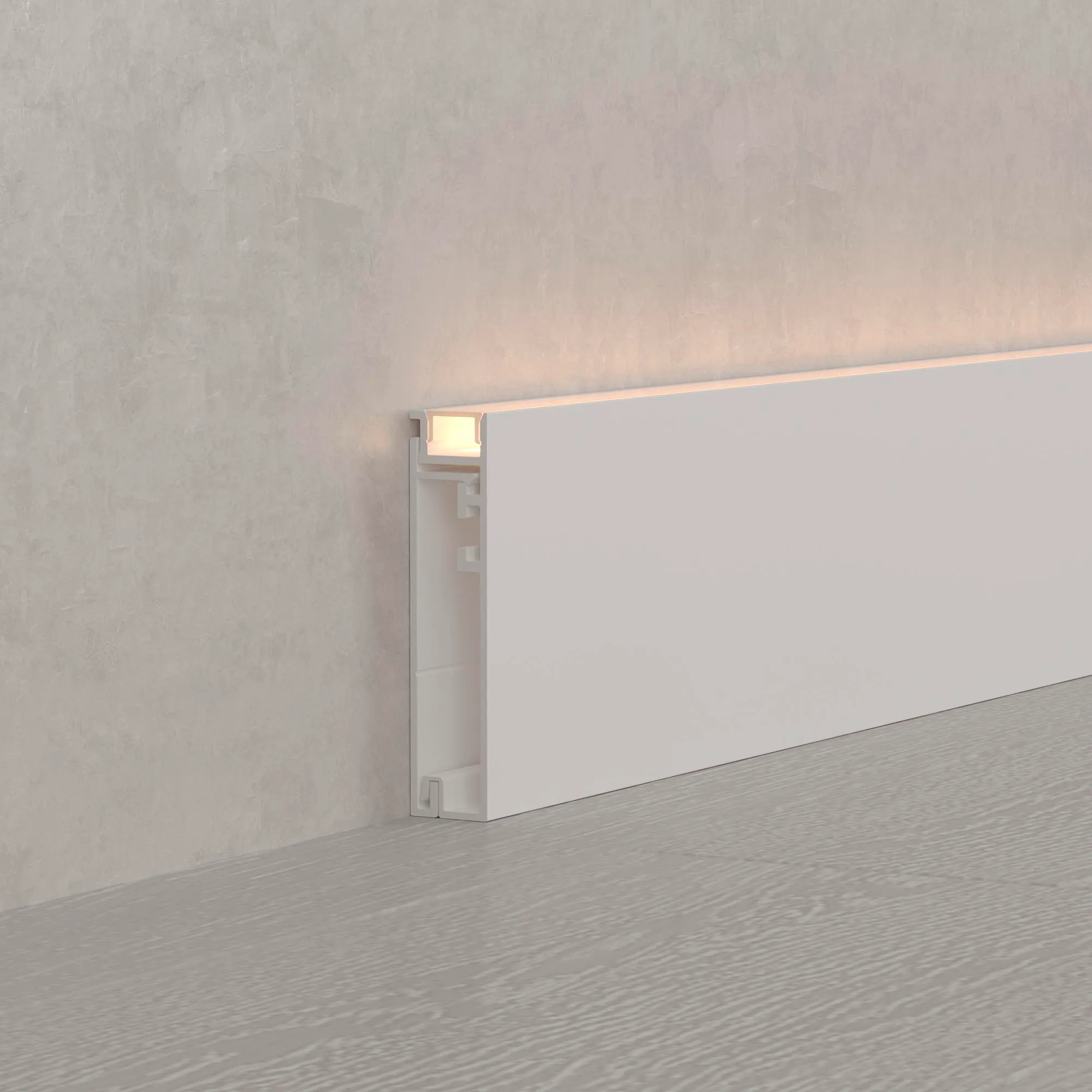Накладной двухкомпонентный алюминиевый профиль-плинтус с кабель-каналом белого цвета для контурной подсветки помещения. Габаритные размеры профиля составляют 2000 мм в длину, 12,2 мм в ширину и 55,5 мм в высоту. Площадка для установки светодиодных лент позволяет использовать ленту шириной до 8 мм и мощностью до 30 Вт/м. Это обеспечивает гибкость в выборе светодиодных лент и создает потрясающие световые решения.