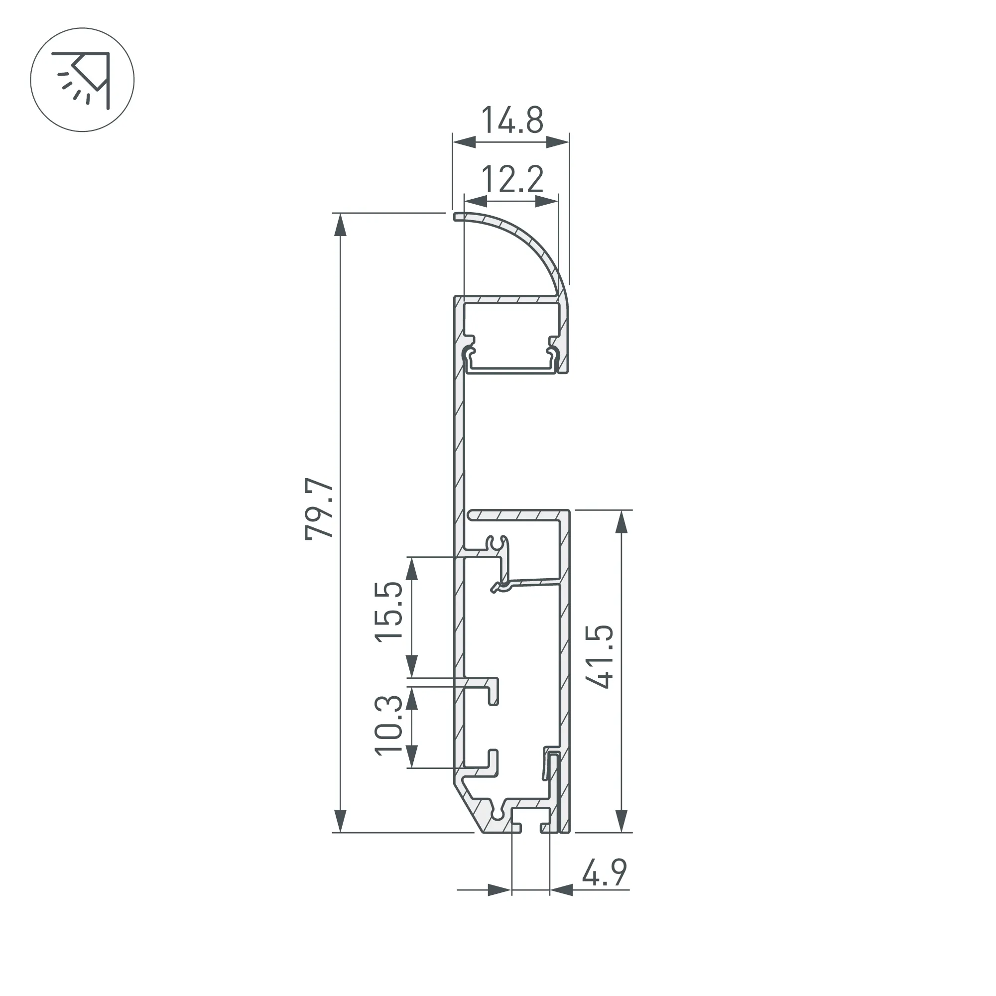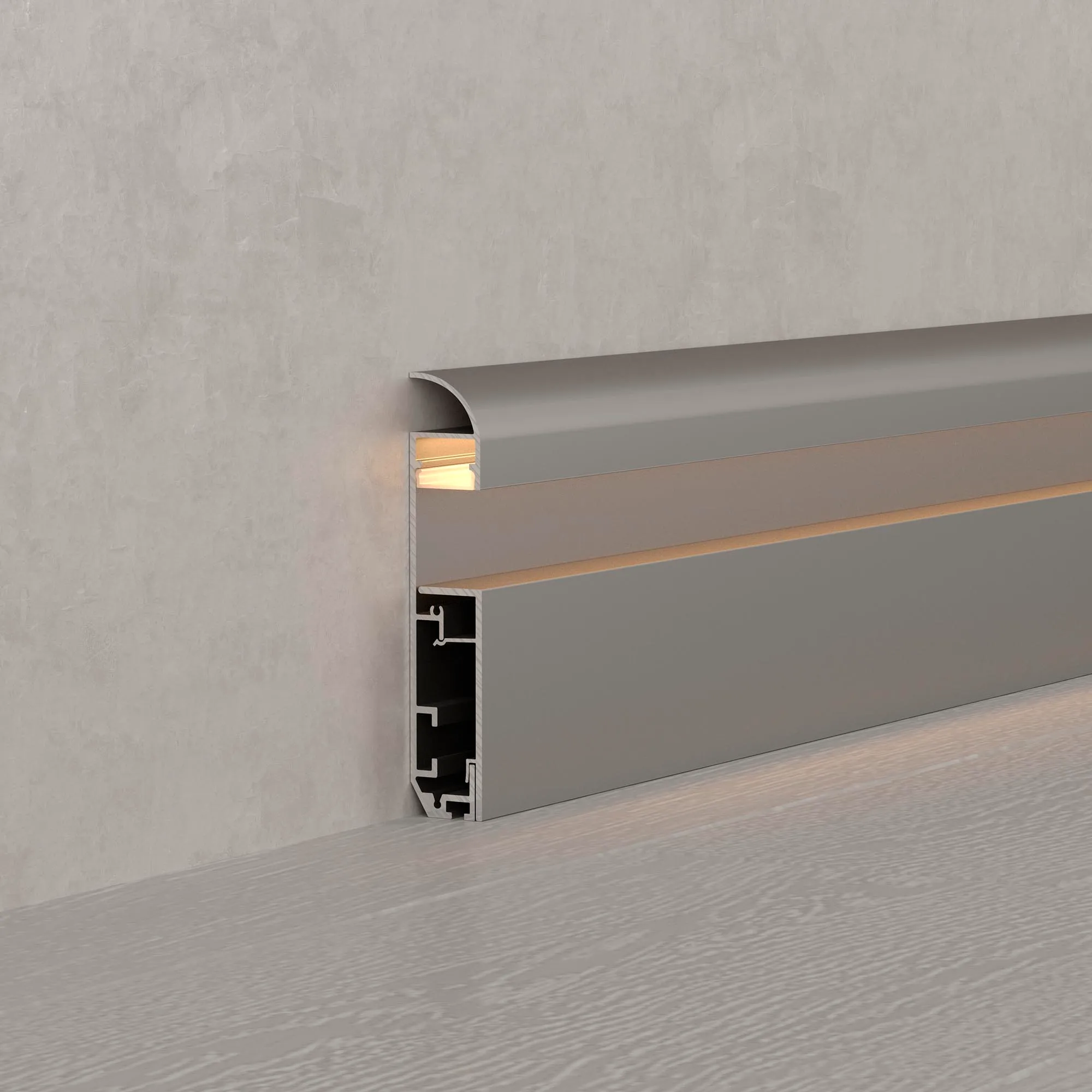 Накладной двухкомпонентный профиль-плинтус из анодированного алюминия с кабель-каналом для контурной подсветки помещения. Габаритные размеры профиля составляют 2000 мм в длину, 14,8 мм в ширину и 79,7 мм в высоту. Площадка для установки светодиодных лент позволяет использовать ленту шириной до 12,2 мм и мощностью до 28 Вт/м. Это обеспечивает гибкость в выборе светодиодных лент и создает потрясающие световые решения.