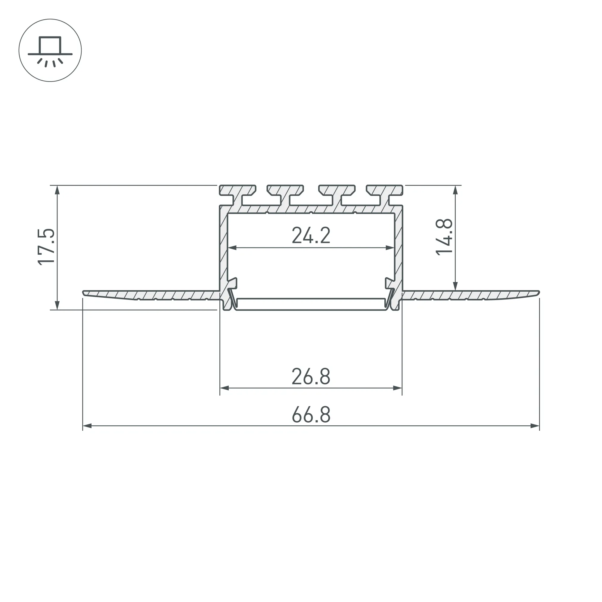 Габаритные размеры профиля составляют 3000 мм в длину, 67 мм в ширину и 18 мм в высоту. Площадка для установки светодиодных лент позволяет использовать ленту шириной до 24 мм и мощностью до 37,4 Вт/м. Это обеспечивает гибкость в выборе светодиодных лент и создает потрясающие световые решения.
