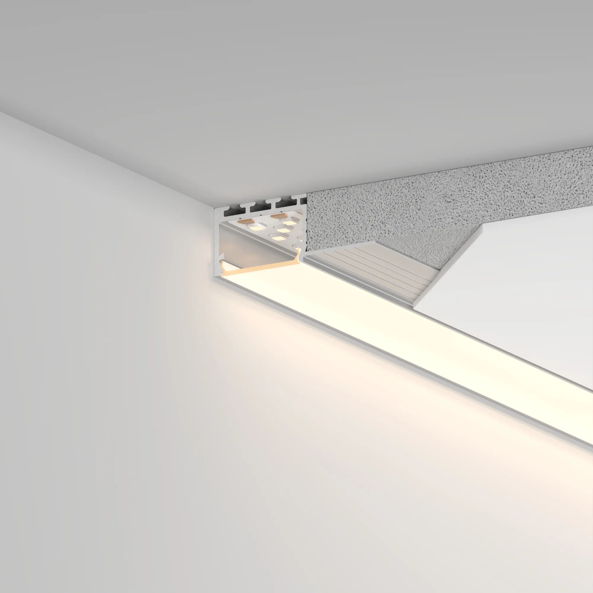 Угловой встраиваемый профиль со скрытым фланцем под строительную отделку из алюминия для установки в гипсокартон толщиной 16 мм для контурной подсветки.
