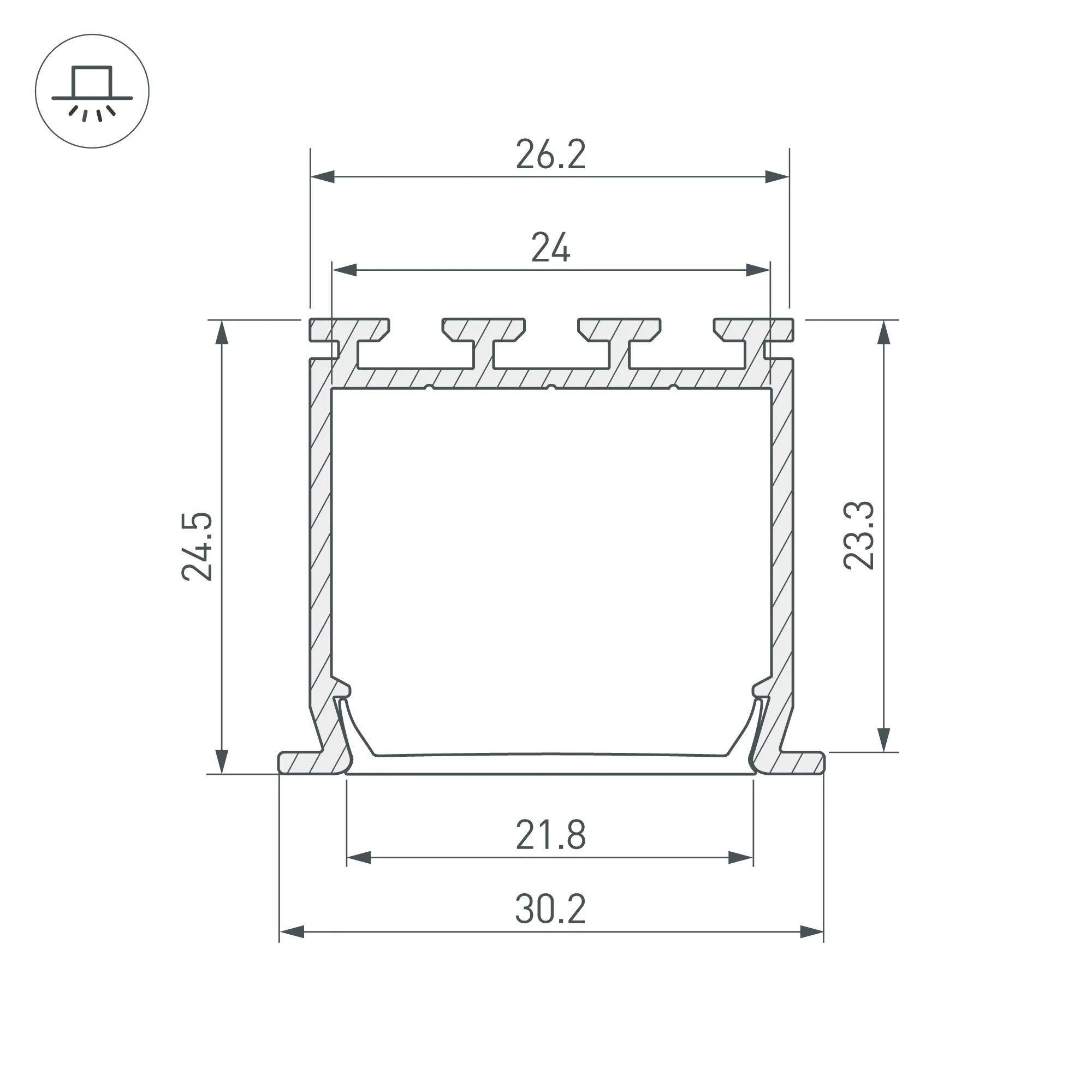 Габаритные размеры профиля составляют 3000 мм в длину, 30 мм в ширину и 25 мм в высоту. Площадка для установки светодиодных лент позволяет использовать ленту шириной до 24 мм и мощностью до 27,5 Вт/м. Это обеспечивает гибкость в выборе светодиодных лент и создает потрясающие световые решения.
