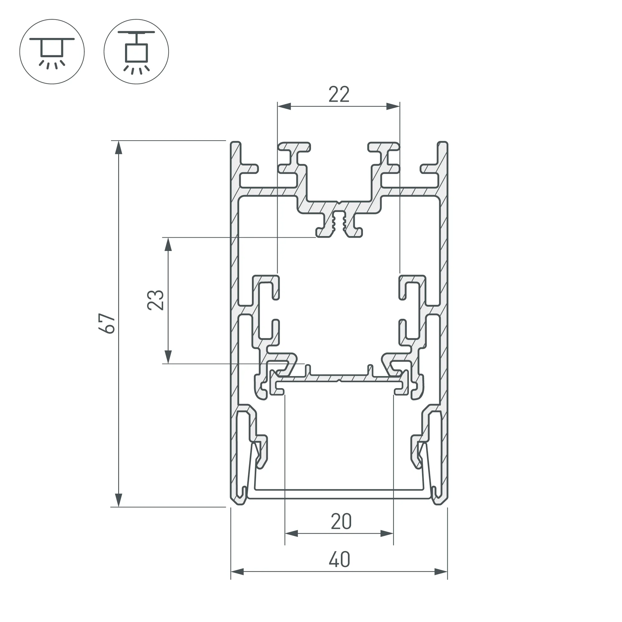 Отсек для блока питания (22х22 мм) и съемная площадка для светодиодной ленты с фиксаторами значительно облегчают сервисное обслуживание осветительного оборудования. Габаритные размеры профиля составляют 2500 мм в длину, 40 мм в ширину и 67 мм в высоту. Площадка для установки светодиодных лент позволяет использовать ленту шириной до 20 мм и мощностью до 56 Вт/м. Это обеспечивает гибкость в выборе светодиодных лент и создает потрясающие световые решения.