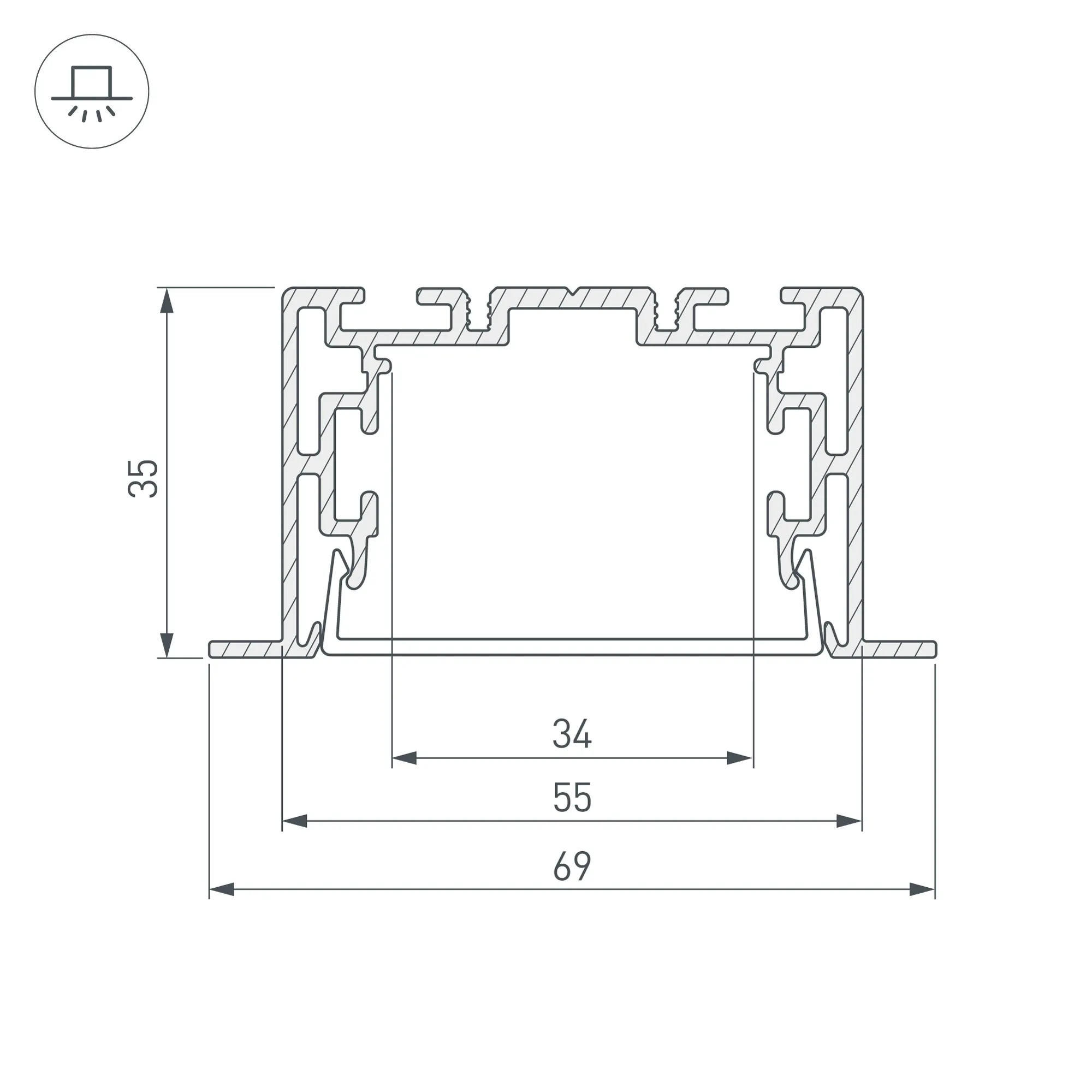 Габаритные размеры профиля составляют 2500 мм в длину, 69 мм в ширину и 35 мм в высоту. Площадка для установки светодиодных лент позволяет использовать ленту шириной до 34 мм и мощностью до 51 Вт/м. Это обеспечивает гибкость в выборе светодиодных лент и создает потрясающие световые решения.