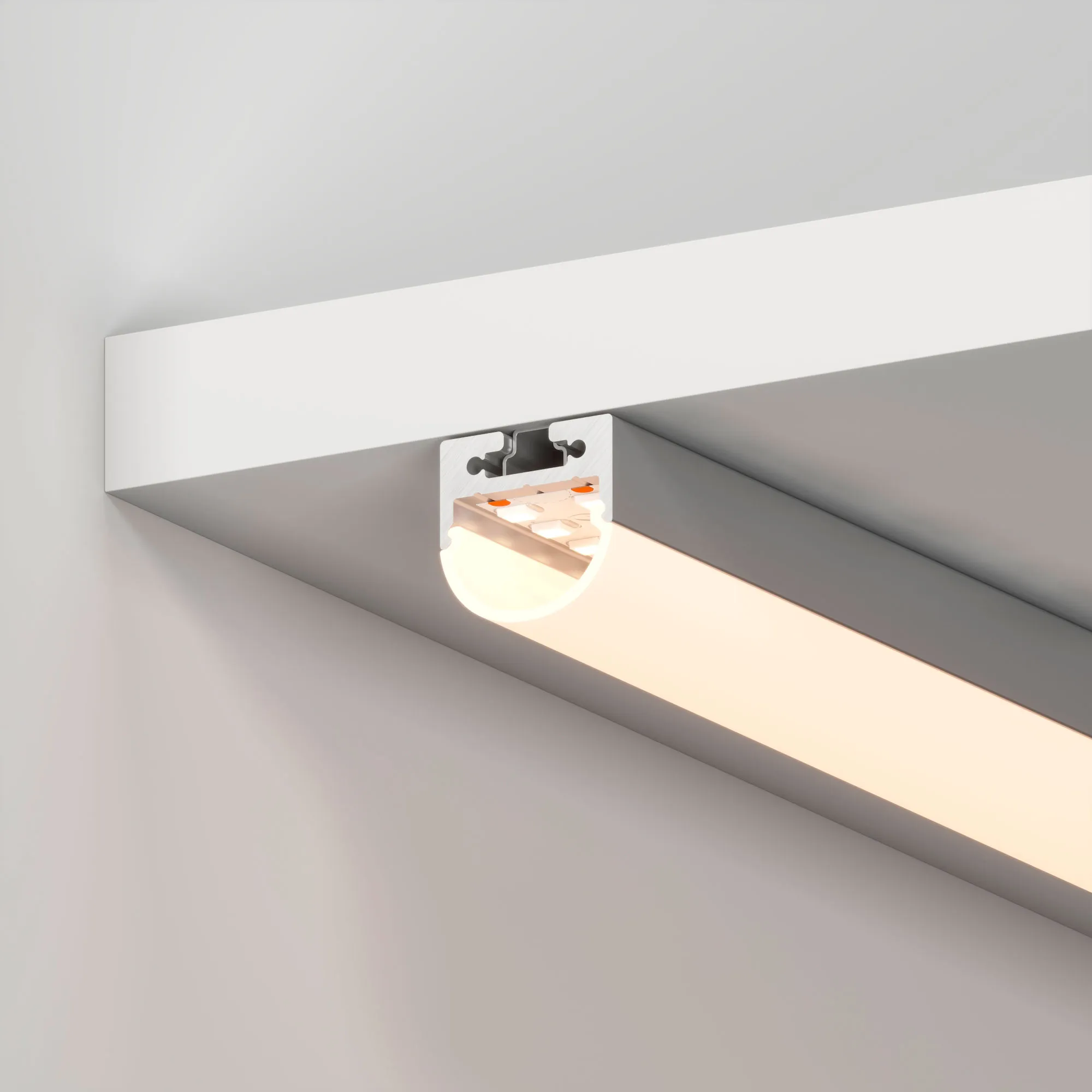 Накладной/подвесной профиль из анодированного алюминия в комплекте с полукруглым матовым экраном со светопропусканием 76% для контурной подсветки помещений.