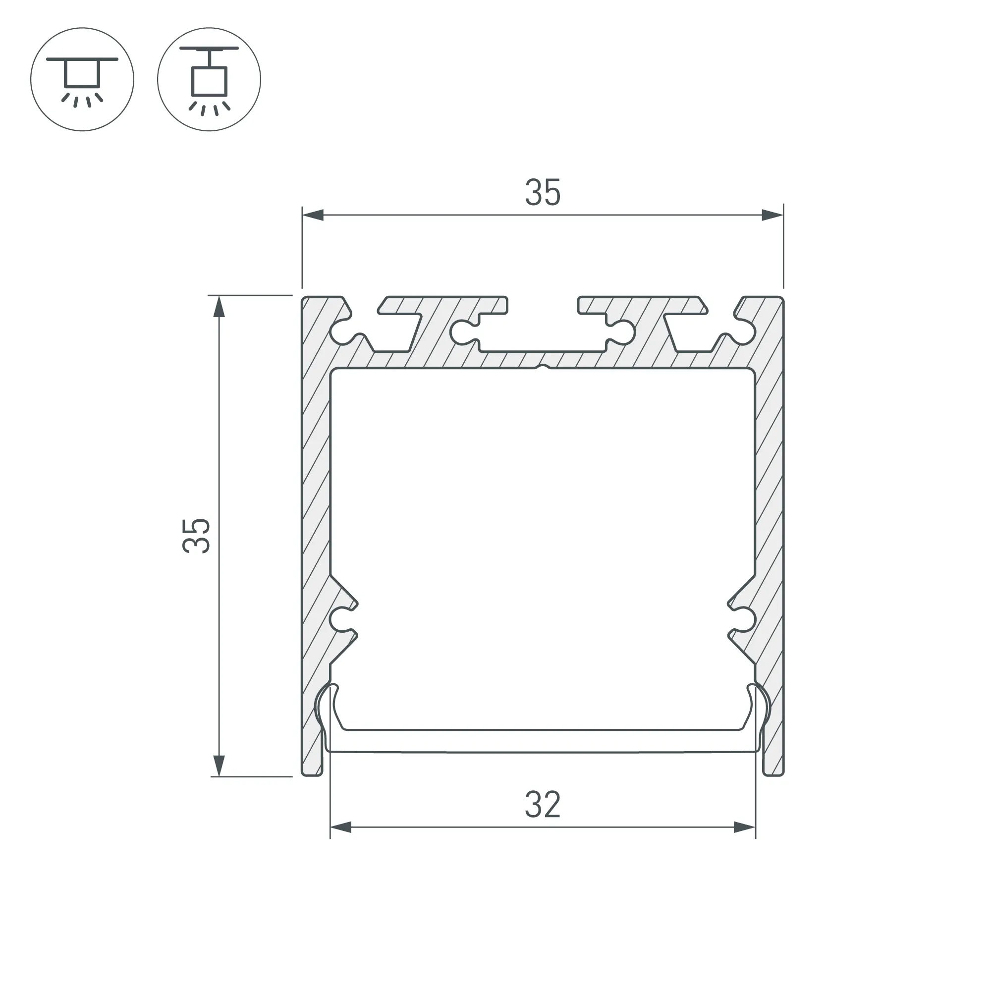 Габаритные размеры профиля составляют 2500 мм в длину, 35 мм в ширину и 35 мм в высоту. Площадка для установки светодиодных лент позволяет использовать ленту шириной до 31 мм и мощностью до 36,7 Вт/м. Это обеспечивает гибкость в выборе светодиодных лент и создает потрясающие световые решения.