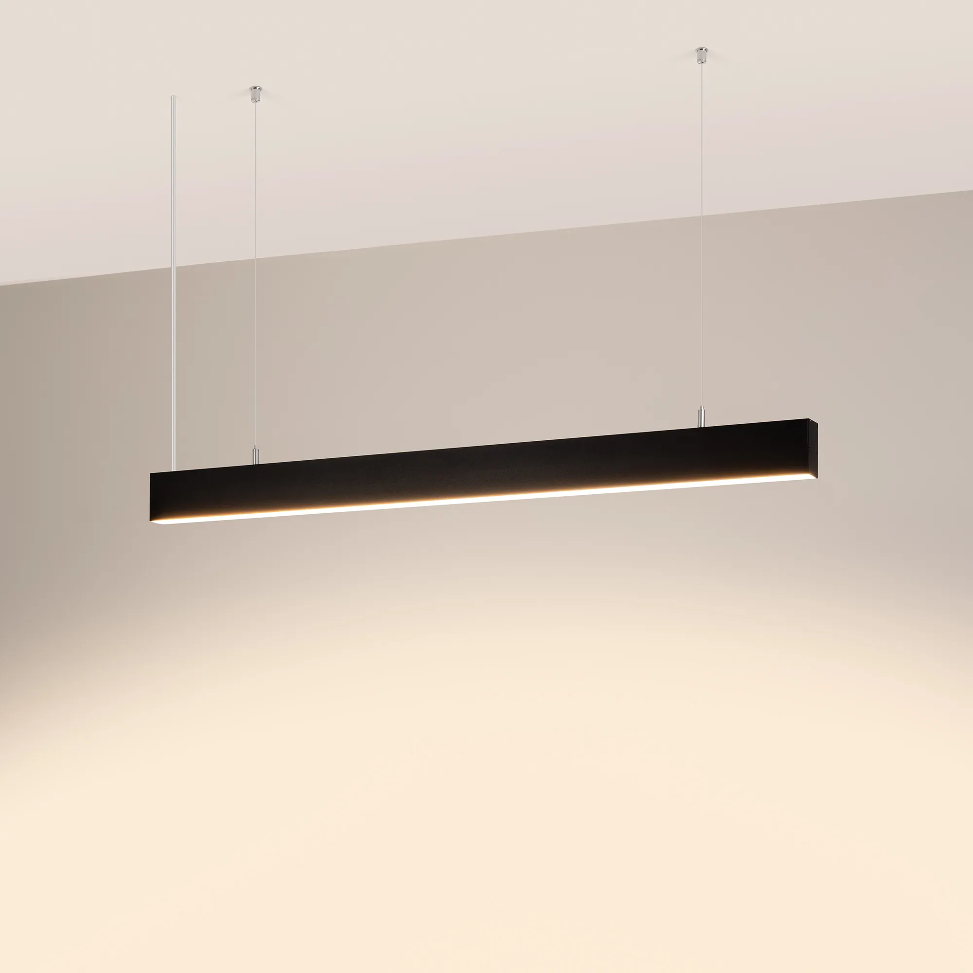 Подвесной/накладной/встраиваемый профиль черного цвета из алюминия с отсеком для блока питания (30х32 мм) в комплекте с матовым рассеивателем из поликарбоната со светопропусканием 67% и заглушками идеально подходит для основного освещения и контурной подсветки.