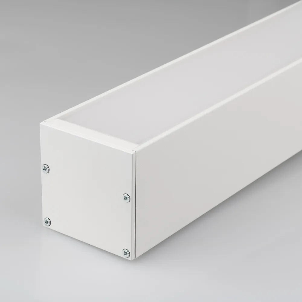 Подвесной/накладной профиль белого цвета из алюминия с отсеком для блока питания (46х22 мм) в комплекте с матовым рассеивателем из поликарбоната со светопропусканием 67% и заглушками идеально подходит для основного освещения и контурной подсветки.