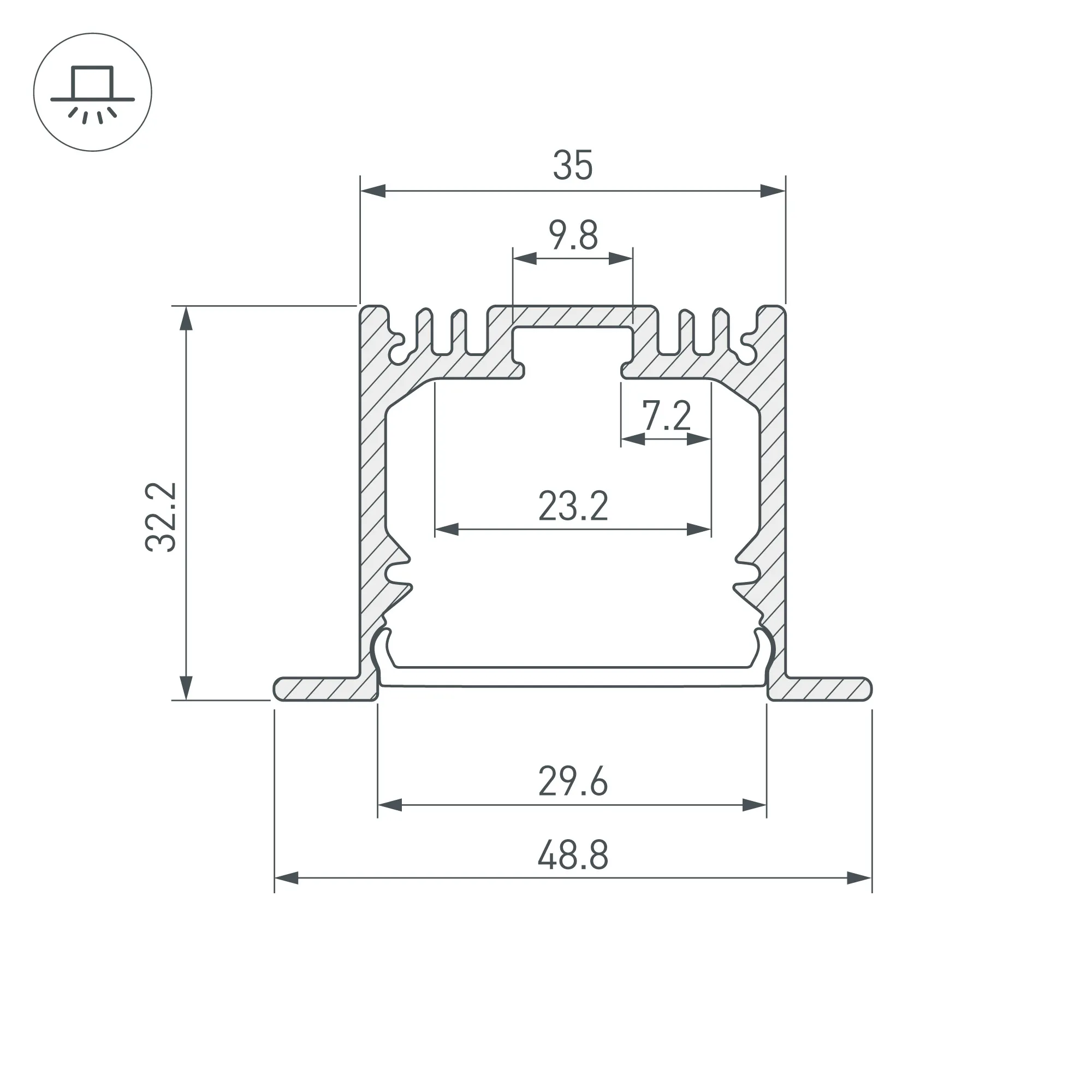 Габаритные размеры профиля составляют 2500 мм в длину, 49 мм в ширину и 32 мм в высоту. Площадка для установки светодиодных лент позволяет использовать ленту шириной до 23 мм и мощностью до 39,4 Вт/м. Это обеспечивает гибкость в выборе светодиодных лент и создает потрясающие световые решения.