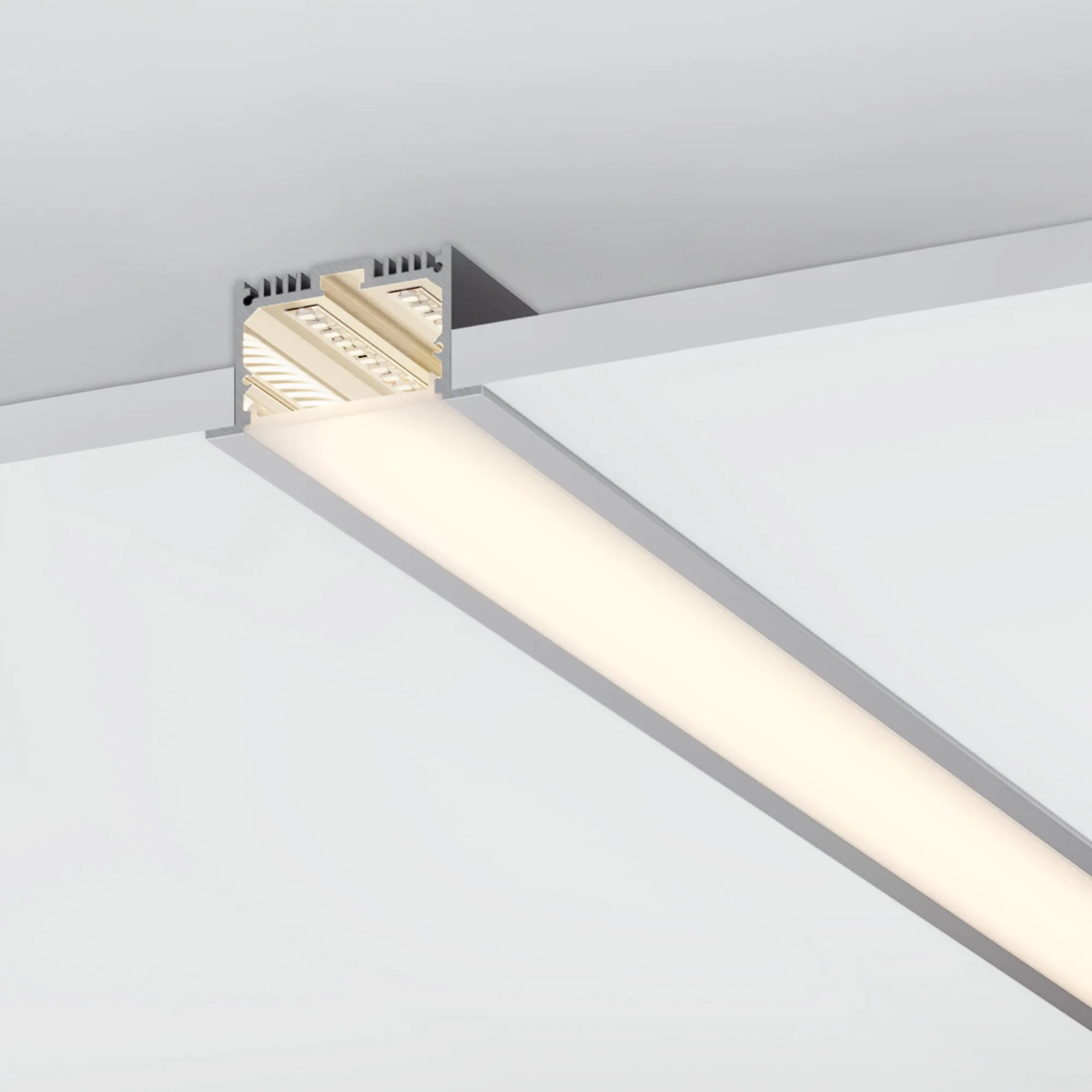 Встраиваемый профиль с накладным фланцем из анодированного алюминия в комплекте с матовым рассеивателем со светопропусканием 67% идеально подходит для основного освещения и контурной подсветки.