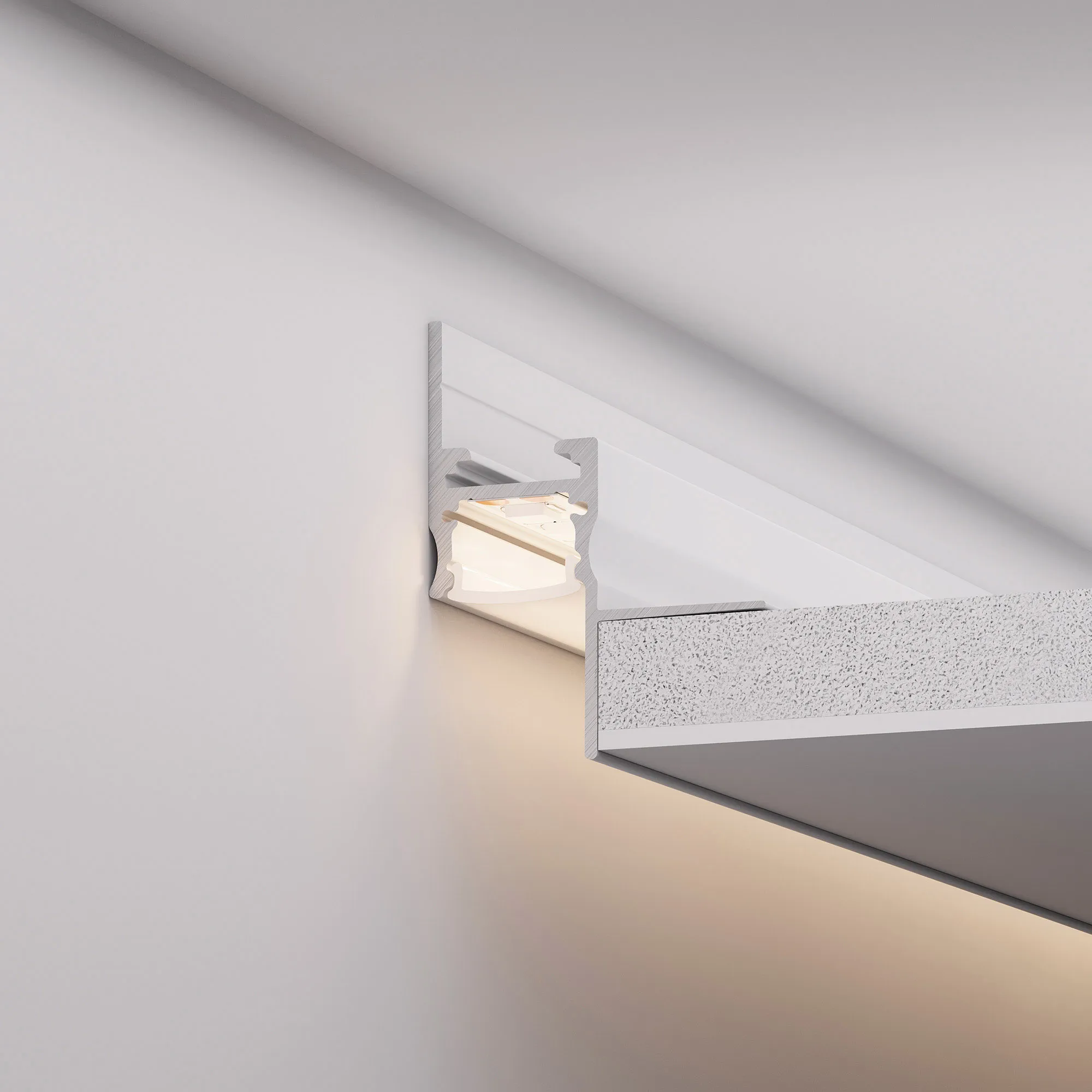 Встраиваемый алюминиевый профиль белого цвета со скрытым фланцем устанавливается в потолки и потолочные ниши из гипсокартона, образуя теневой зазор между потолком и стеной. Такое решение создает визуальный эффект потолка, парящего в воздухе с мягким свечением по периметру комнаты.