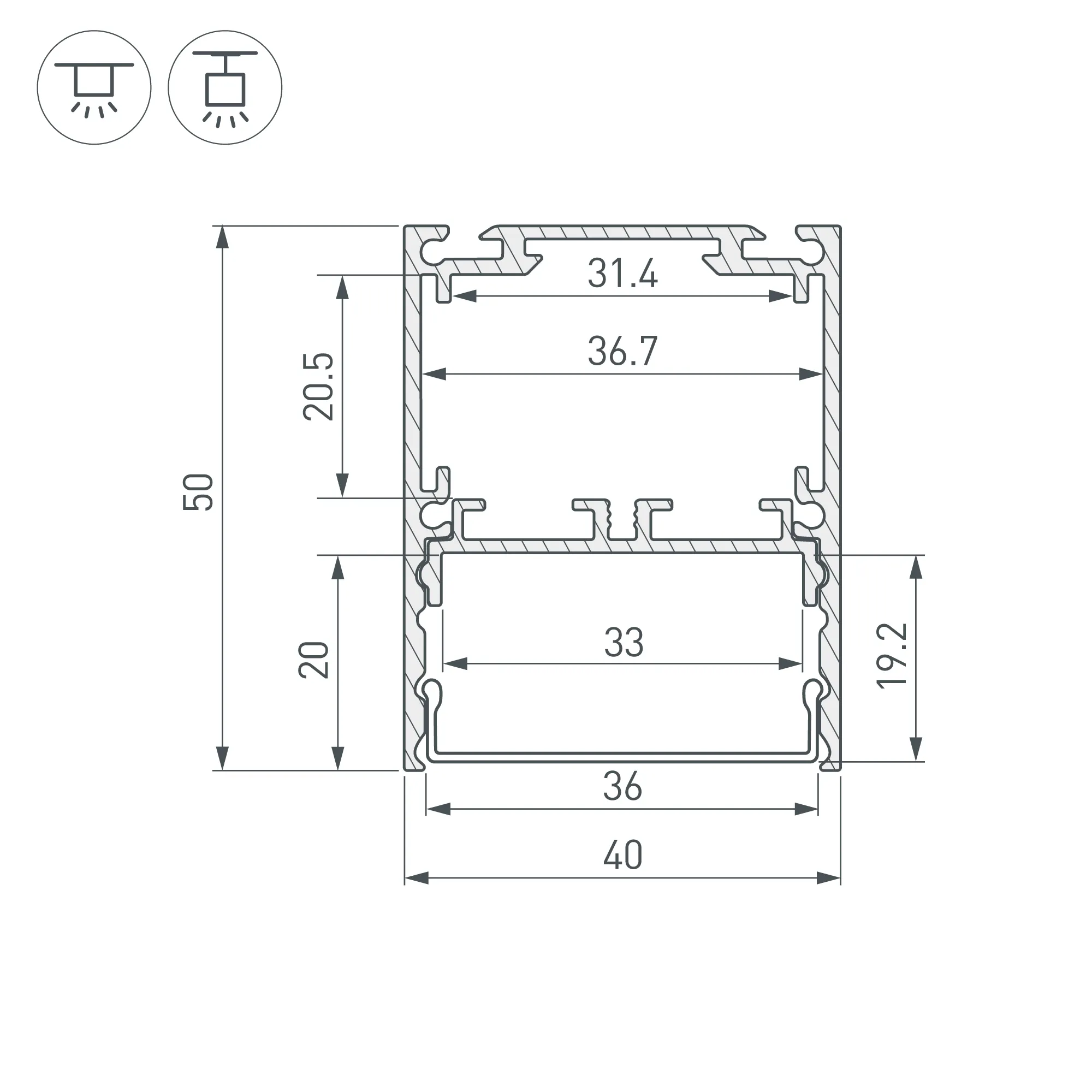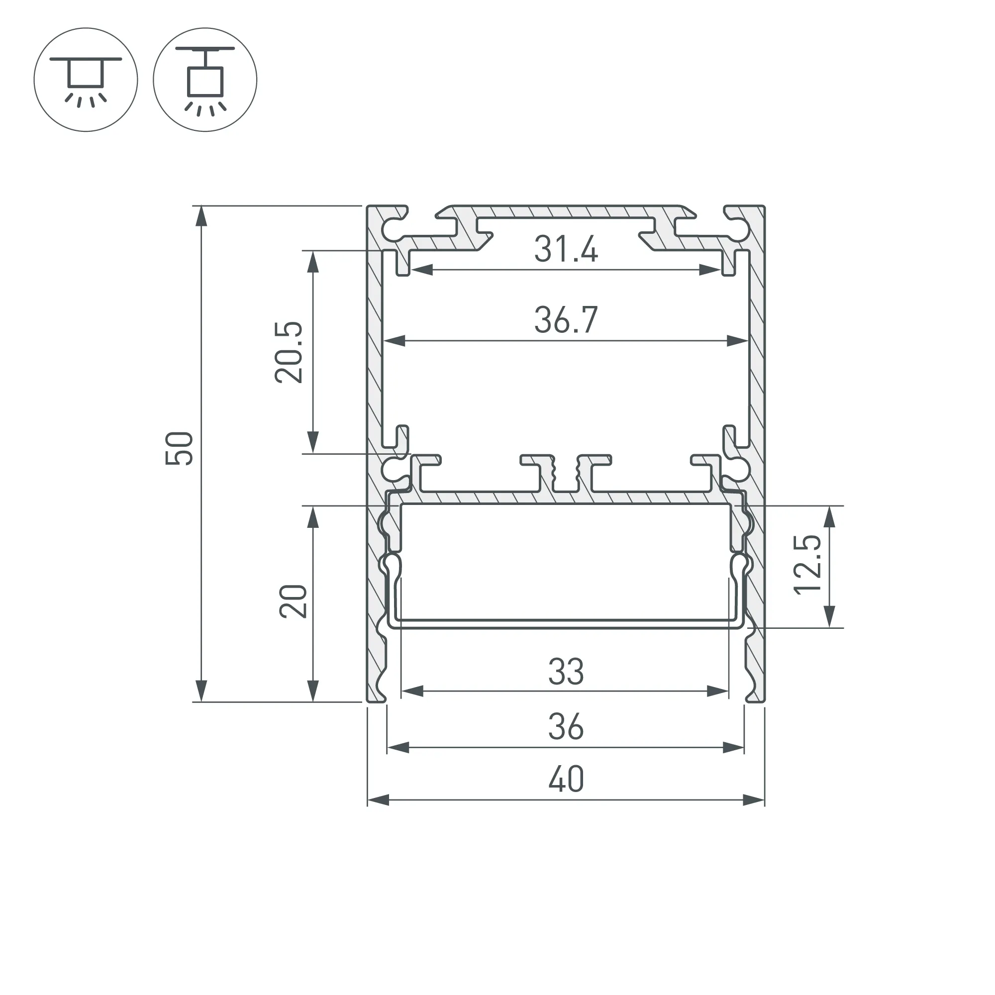 Отсек для блока питания (31,4х20,5 мм) и съемная площадка для светодиодной ленты значительно облегчают сервисное обслуживание осветительного оборудования. Габаритные размеры профиля составляют 2000 мм в длину, 40 мм в ширину и 50,6 мм в высоту. Площадки для установки светодиодных лент позволяют использовать ленты шириной до 33 мм и мощностью до 47 Вт/м. Это обеспечивает гибкость в выборе светодиодных лент и создает потрясающие световые решения.