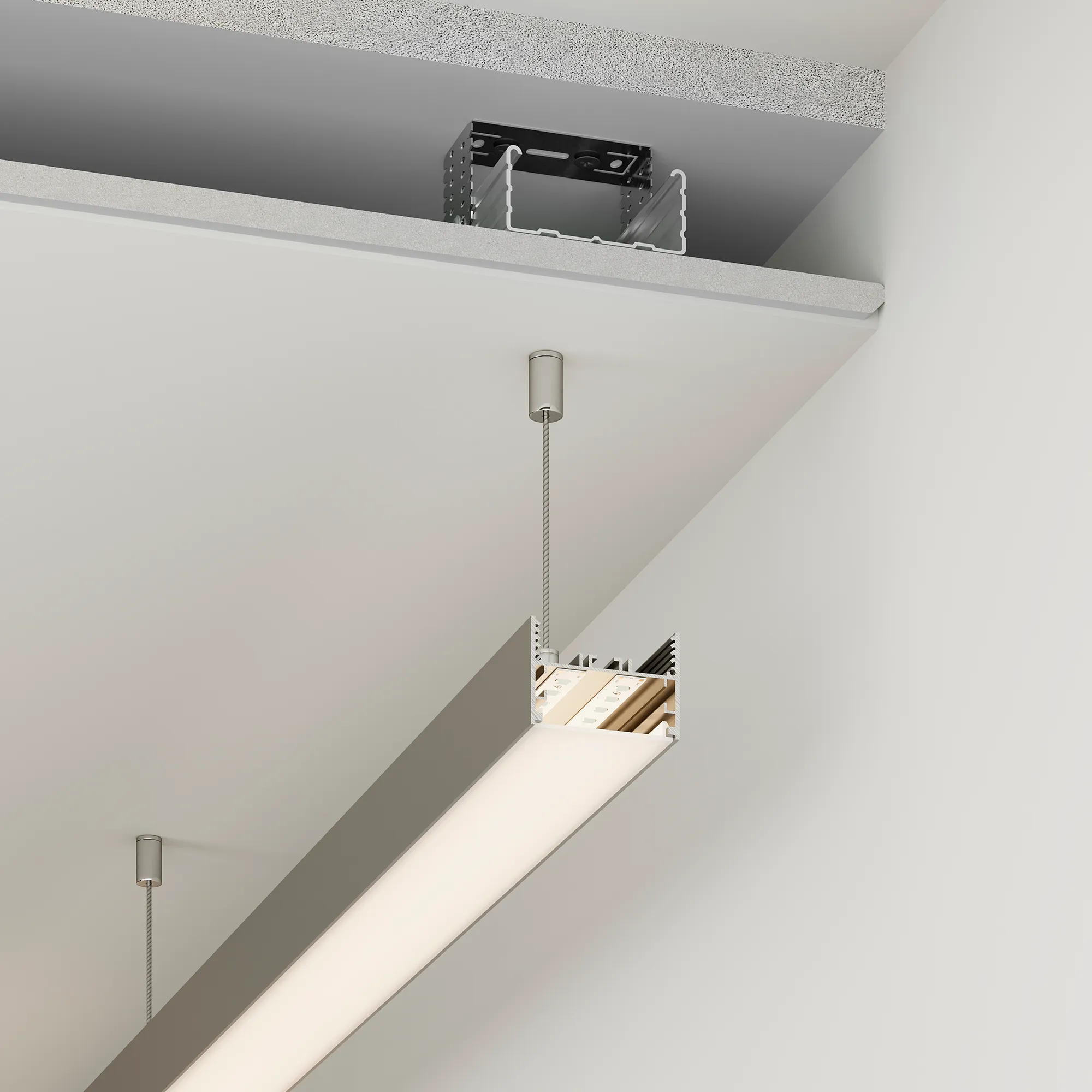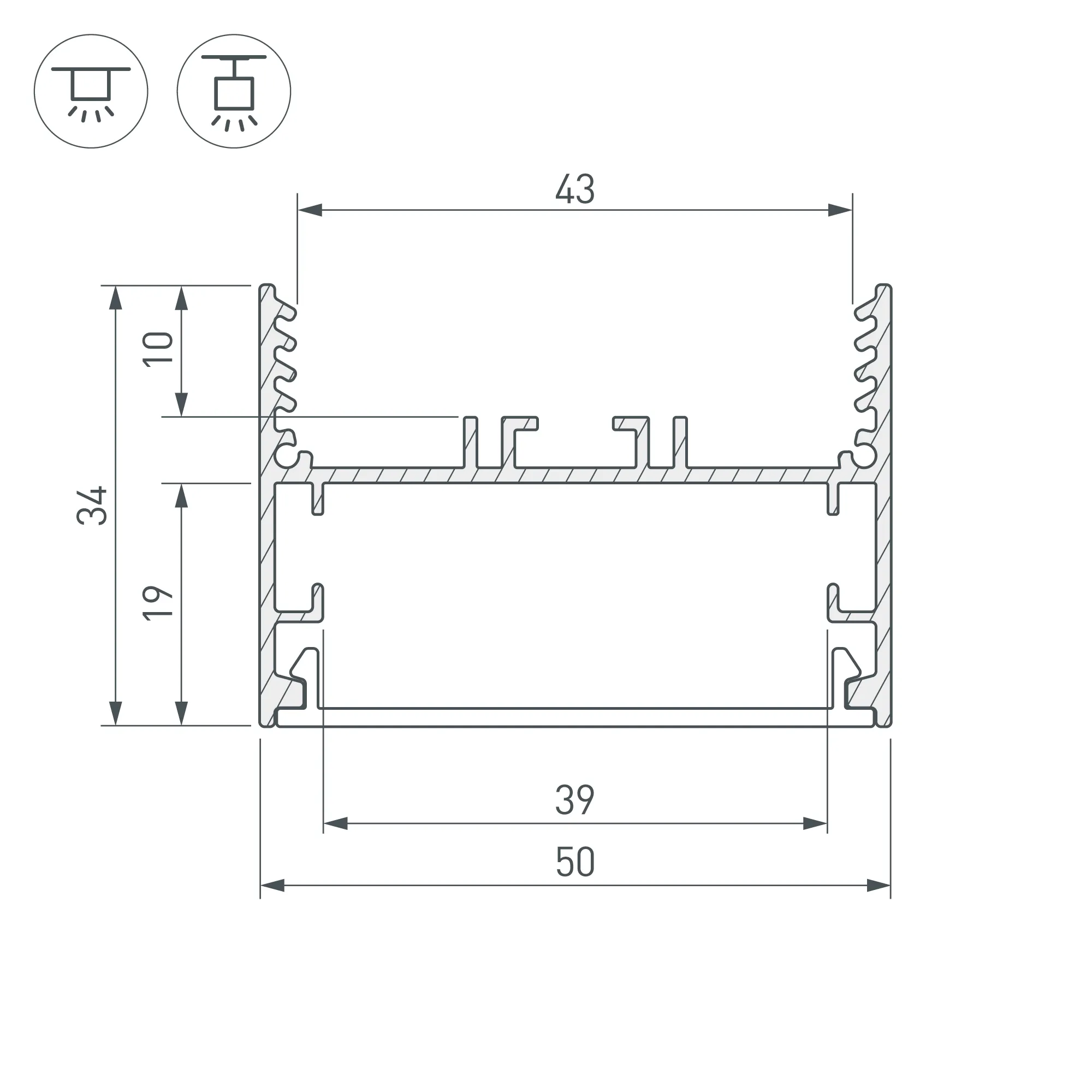 Подвесной/накладной профиль из анодированного алюминия для основной и контурной подсветки помещений. Габаритные размеры профиля составляют 2000 мм в длину, 50 мм в ширину и 34 мм в высоту. Площадка для установки светодиодных лент позволяет использовать ленту шириной до 38 мм и мощностью до 44,4 Вт/м. Это обеспечивает гибкость в выборе светодиодных лент и создает потрясающие световые решения.