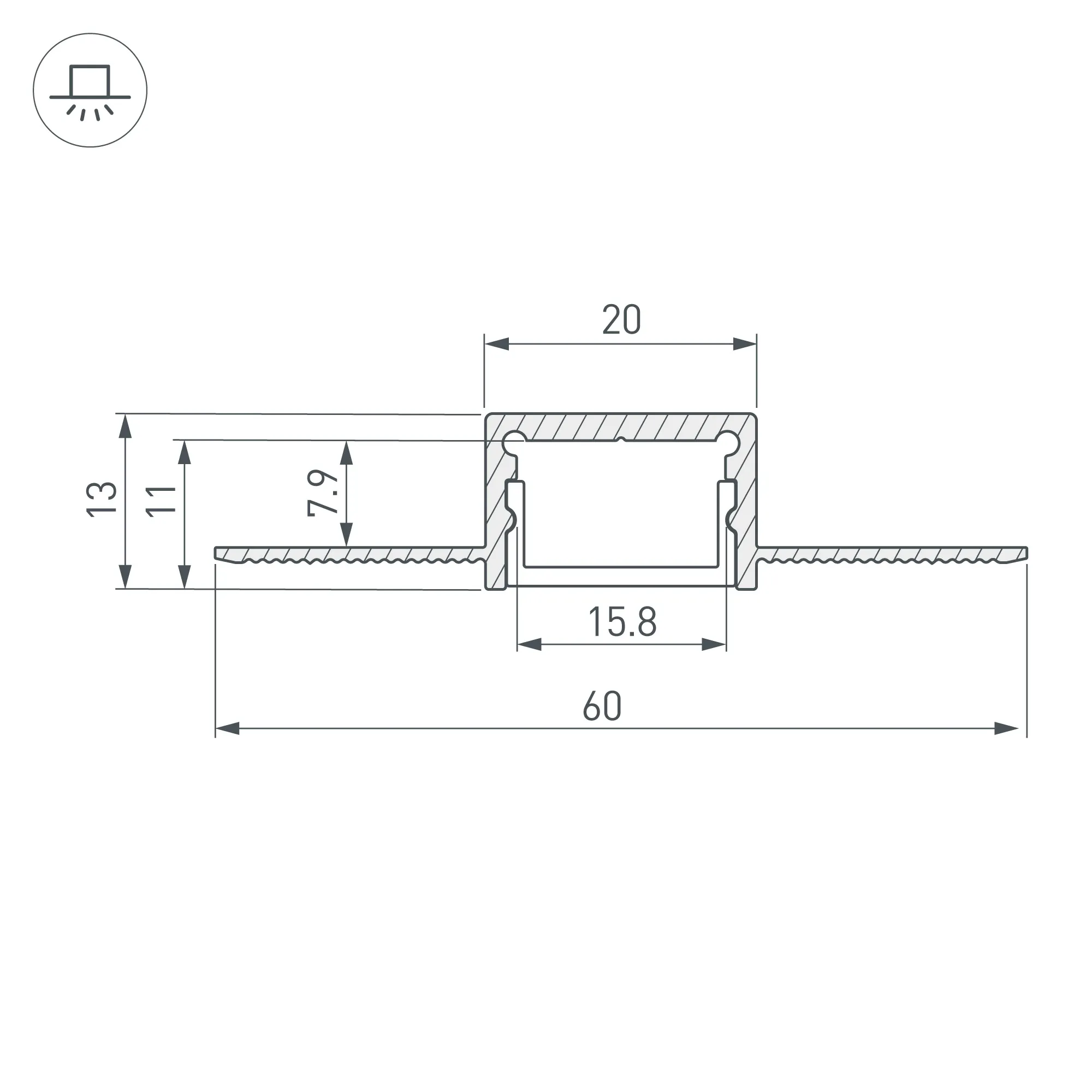 Встраиваемый профиль со скрытым фланцем из анодированного алюминия под строительную отделку для контурной подсветки интерьера. Габаритные размеры профиля составляют 2000 мм в длину, 60 мм в ширину и 13 мм в высоту. Площадка для установки светодиодных лент позволяет использовать ленту шириной до 15 мм и мощностью до 27,7 Вт/м. Это обеспечивает гибкость в выборе светодиодных лент и создает потрясающие световые решения.