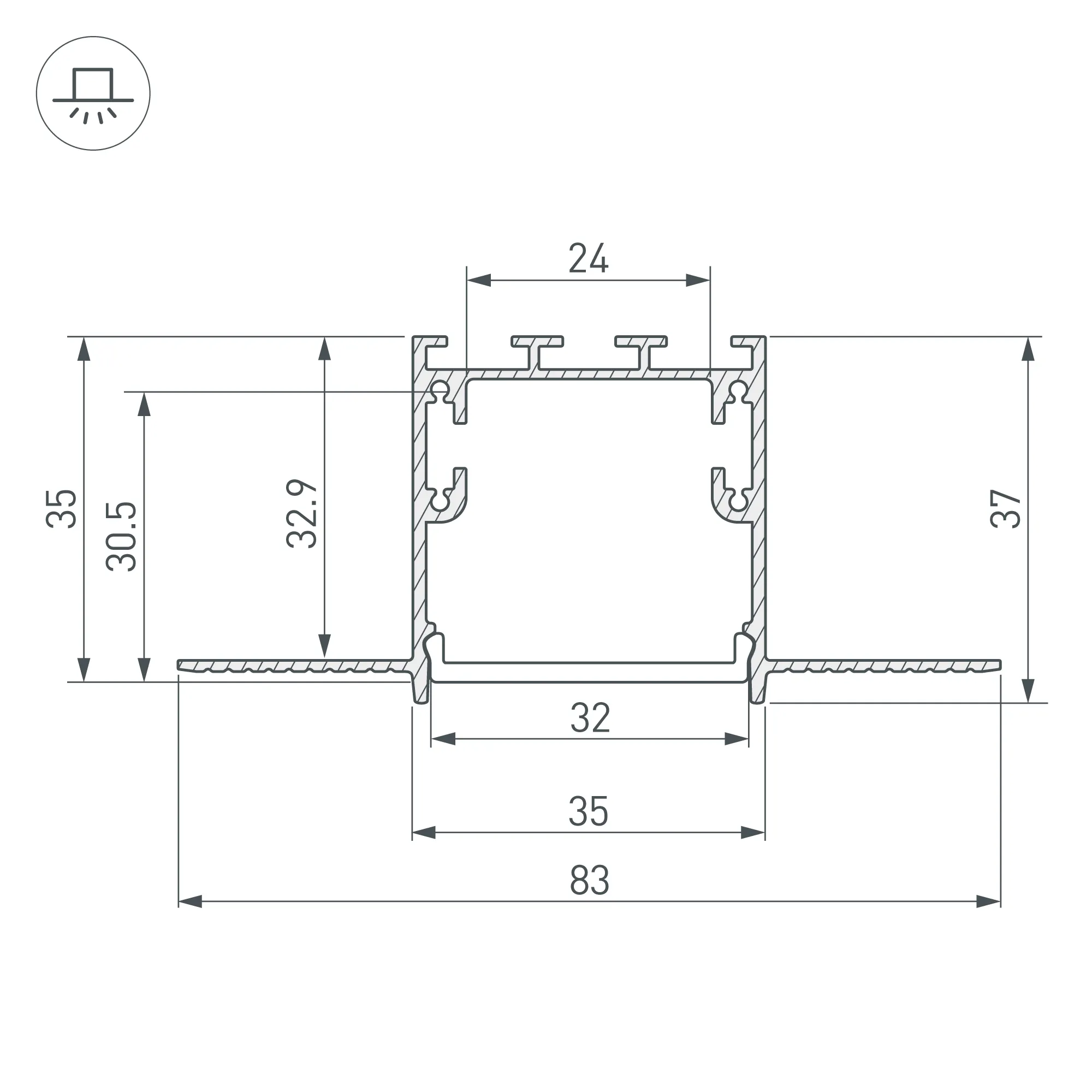 Алюминиевый светотехнический профиль для установки светодиодной ленты или линейки. Цвет серебристый. Длина 2000 мм, размер сечения 83х85 мм. Монтаж осуществляется встраиваемым способом. Фланцы закрашиваются, что позволяет скрыть алюминиевые части профиля, в результате видна только световая линия. Рассеиваемая тепловая мощность 52,5 Вт/м позволяет подобрать источник света как для основного освещения, так и для мягкой декоративной подсветки.