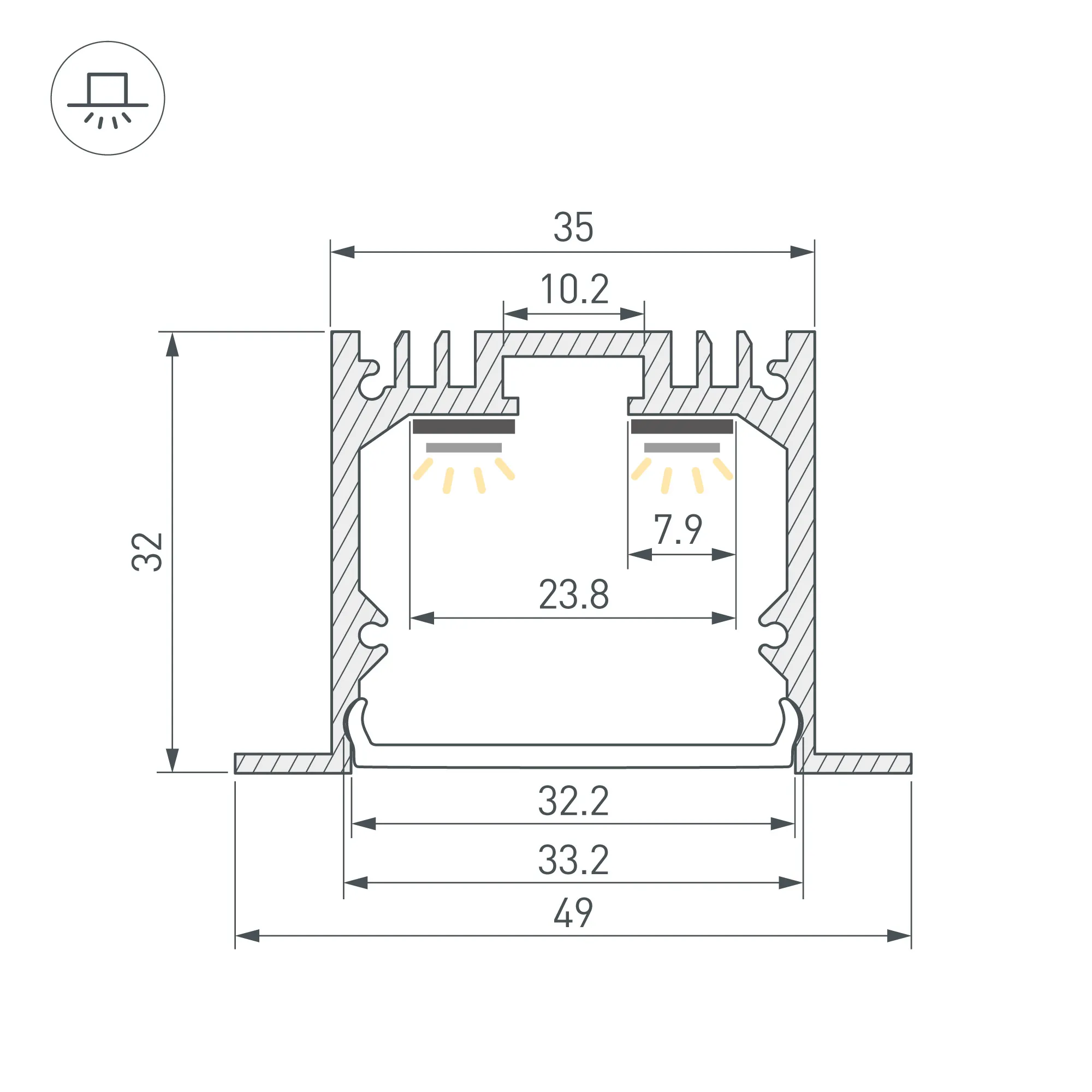 Встраиваемый профиль с накладным фланцем из анодированного алюминия для основной и контурной подсветки помещений. Габаритные размеры профиля составляют 3000 мм в длину, 49 мм в ширину и 32 мм в высоту, паз для установки 35 мм. Площадка для установки светодиодных лент позволяет использовать одну ленту шириной от 17 до 23 мм и мощностью до 39,4 Вт/м или две ленты шириной до 7 мм и мощностью 19,7 Вт/м каждая. Это обеспечивает гибкость в выборе светодиодных лент и создает потрясающие световые решения.