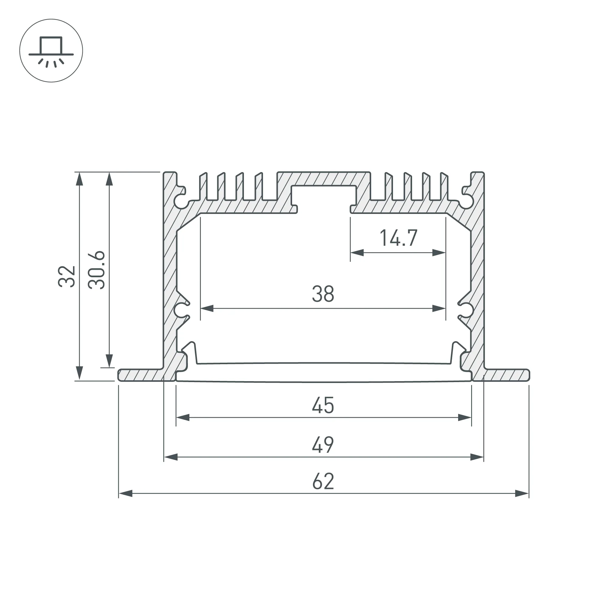 Встраиваемый профиль с накладным фланцем из анодированного алюминия для основной и контурной подсветки помещений. Габаритные размеры профиля составляют 2000 мм в длину, 62 мм в ширину и 32 мм в высоту, паз для установки 49 мм. Площадка для установки светодиодных лент позволяет использовать ленту шириной до 38 мм и мощностью до 46,4 Вт/м. Это обеспечивает гибкость в выборе светодиодных лент и создает потрясающие световые решения.