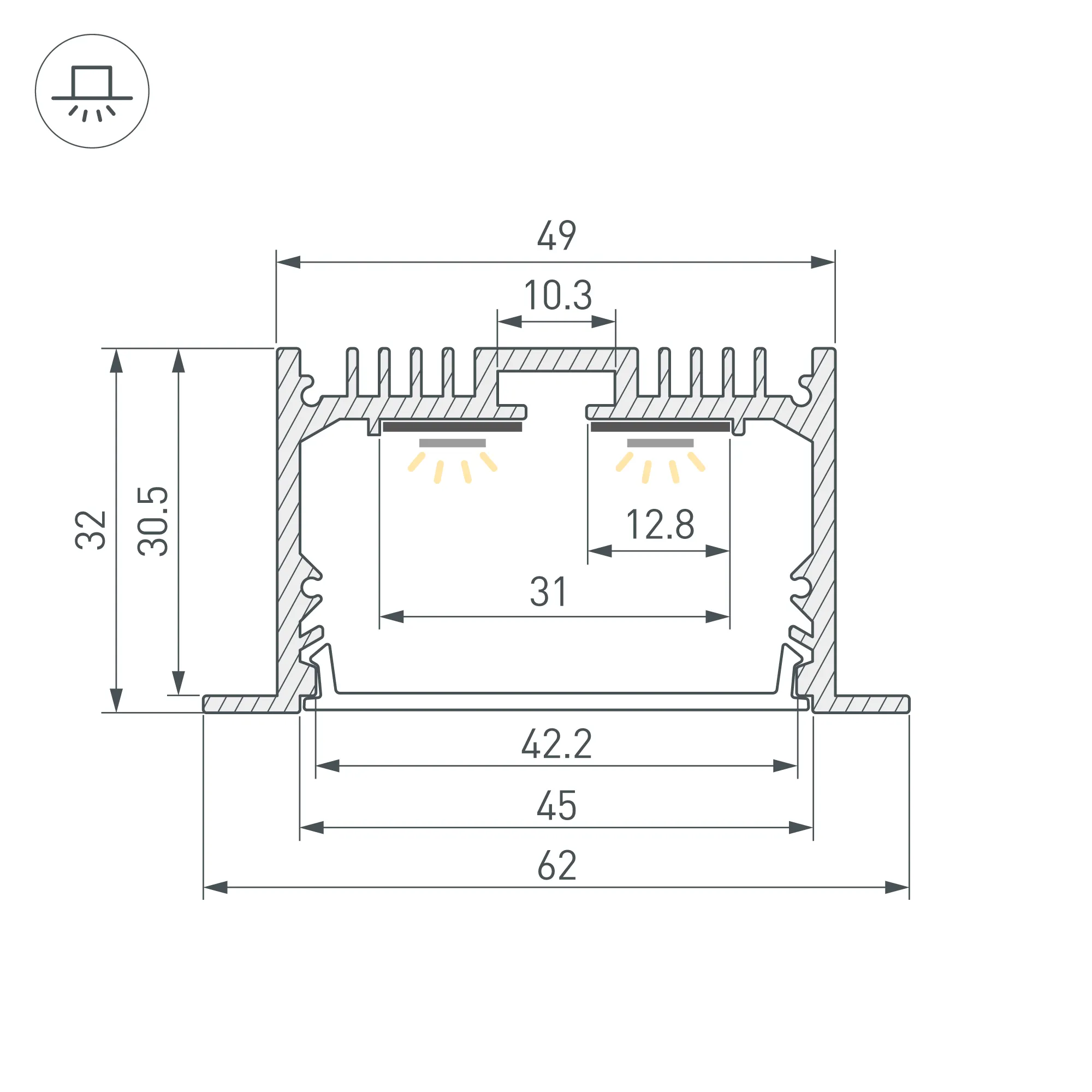 Встраиваемый алюминиевый профиль черного цвета с накладным фланцем для основной и контурной подсветки помещений. Габаритные размеры профиля составляют 2000 мм в длину, 62 мм в ширину и 32 мм в высоту, паз для установки 49 мм. Площадка для установки светодиодных лент позволяет использовать ленту шириной до 31мм и мощностью до 46,4 Вт/м. Это обеспечивает гибкость в выборе светодиодных лент и создает потрясающие световые решения.