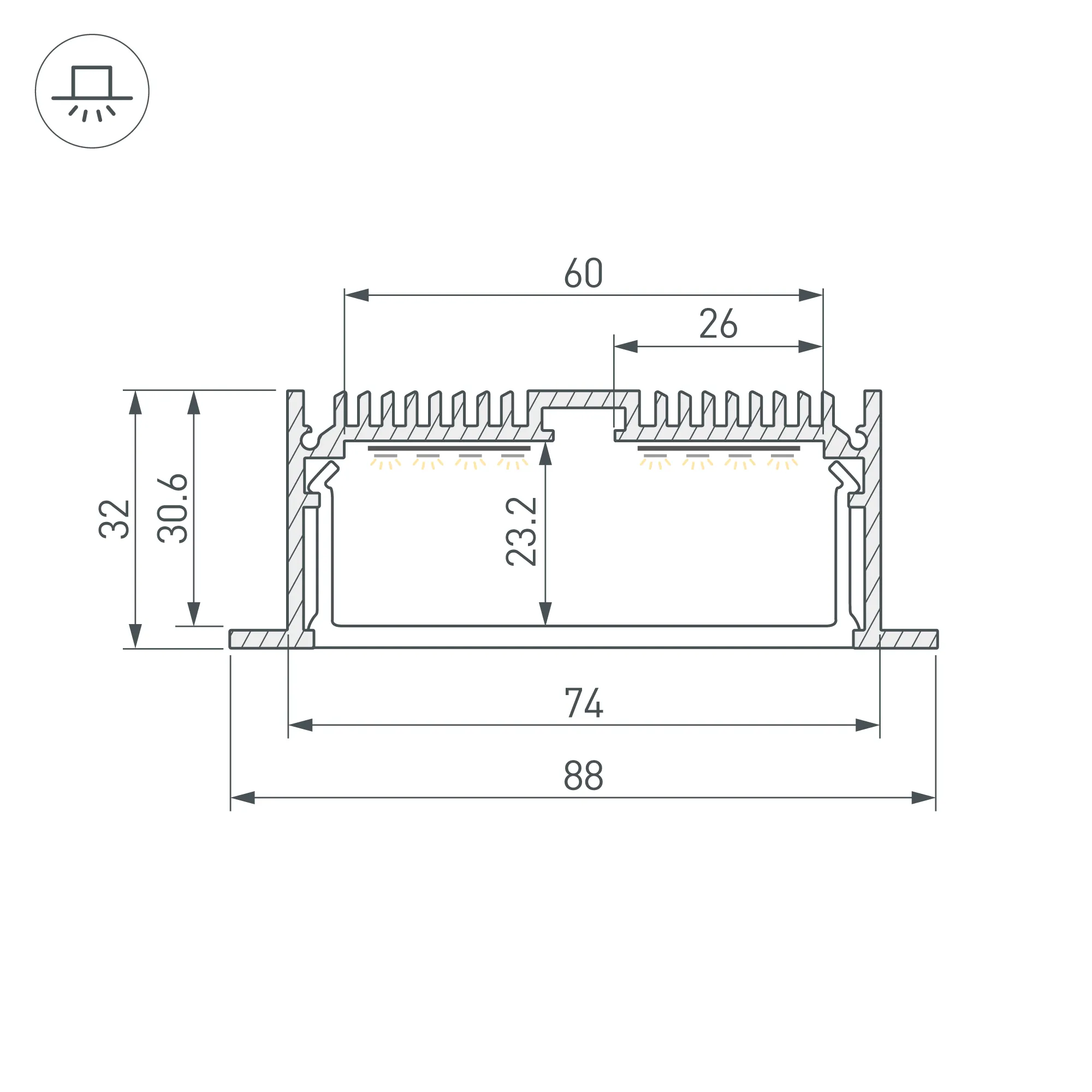 Встраиваемый профиль с накладным фланцем из анодированного алюминия для основной и контурной подсветки помещений. Габаритные размеры профиля составляют 2000 мм в длину, 88 мм в ширину и 32 мм в высоту. Площадка для установки светодиодных лент позволяет использовать ленту шириной до 60 мм и мощностью до 59,7 Вт/м. Это обеспечивает гибкость в выборе светодиодных лент и создает потрясающие световые решения.