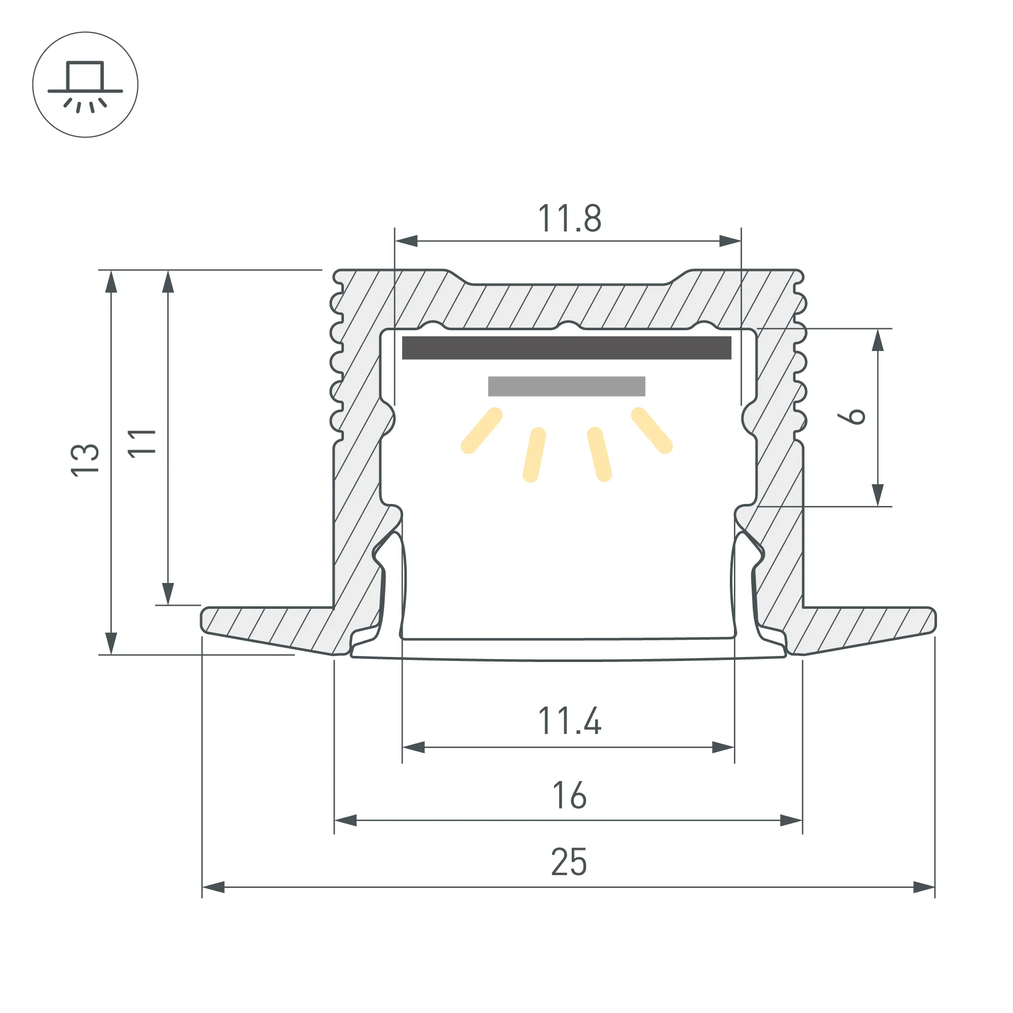 Встраиваемый профиль с накладным фланцем из анодированного алюминия для контурной подсветки интерьера. Габаритные размеры профиля составляют 2000 мм в длину, 25 мм в ширину и 13 мм в высоту. Площадка для установки светодиодных лент позволяет использовать ленту шириной до 12 мм и мощностью до 15,2 Вт/м. Это обеспечивает гибкость в выборе светодиодных лент и создает потрясающие световые решения.