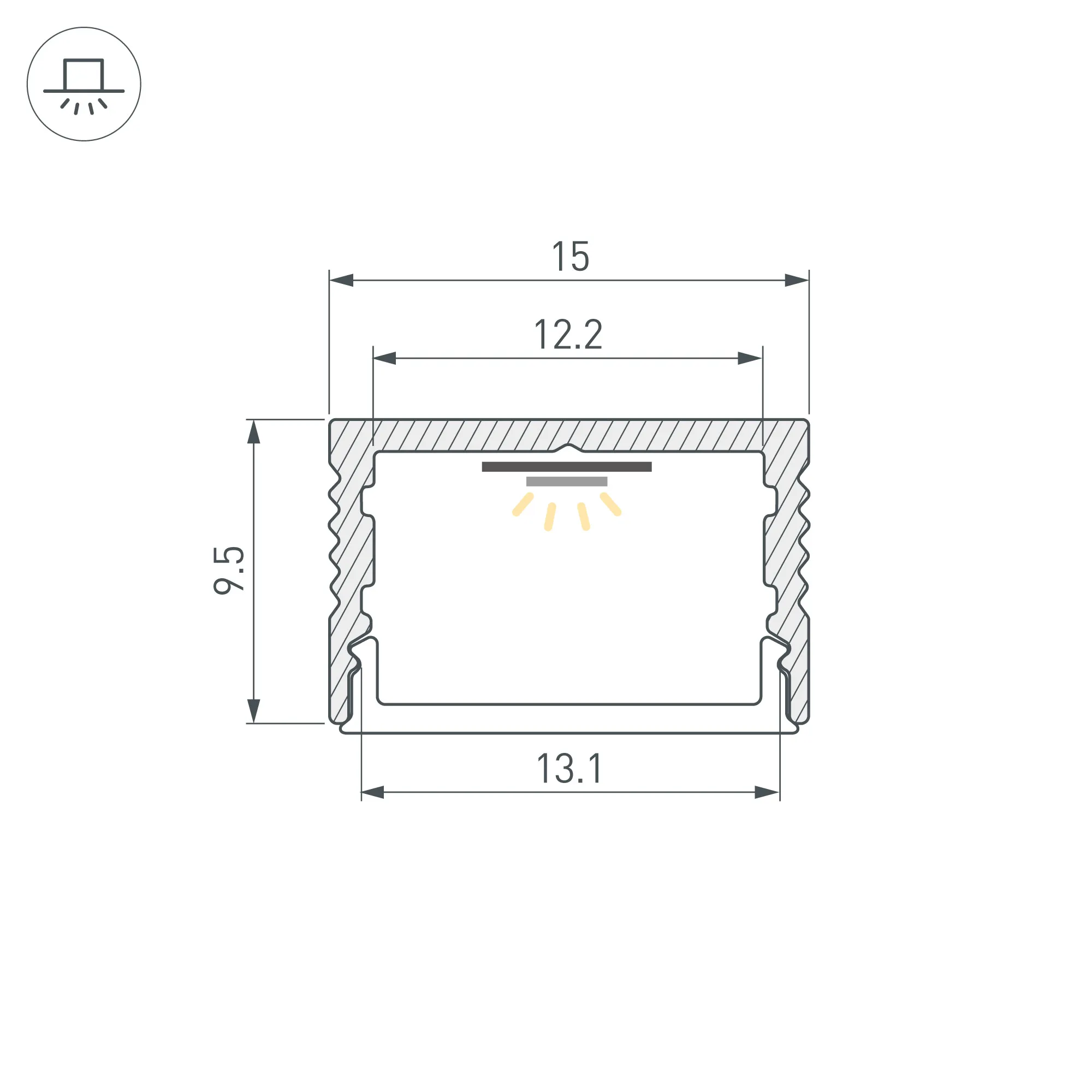 Накладной профиль из анодированного алюминия для основного и дополнительного освещения интерьера. Габаритные размеры профиля составляют 2000 мм в длину, 15 мм в ширину и 9,5 мм в высоту. Площадка для установки светодиодных лент позволяет использовать ленту шириной до 12,2 мм и мощностью до 12 Вт/м. Это обеспечивает гибкость в выборе светодиодных лент и создает потрясающие световые решения.