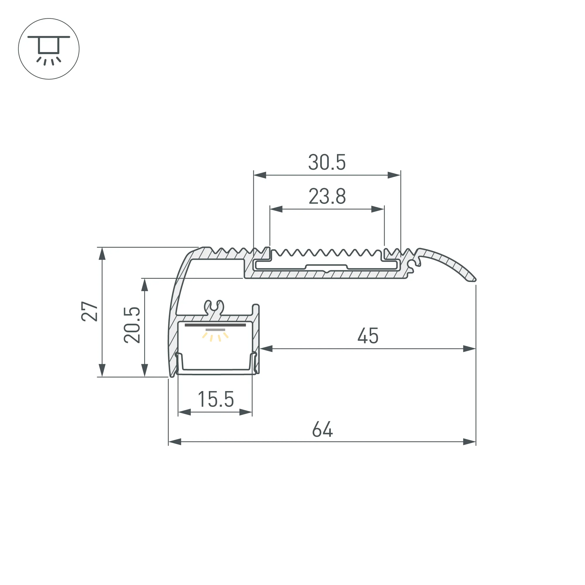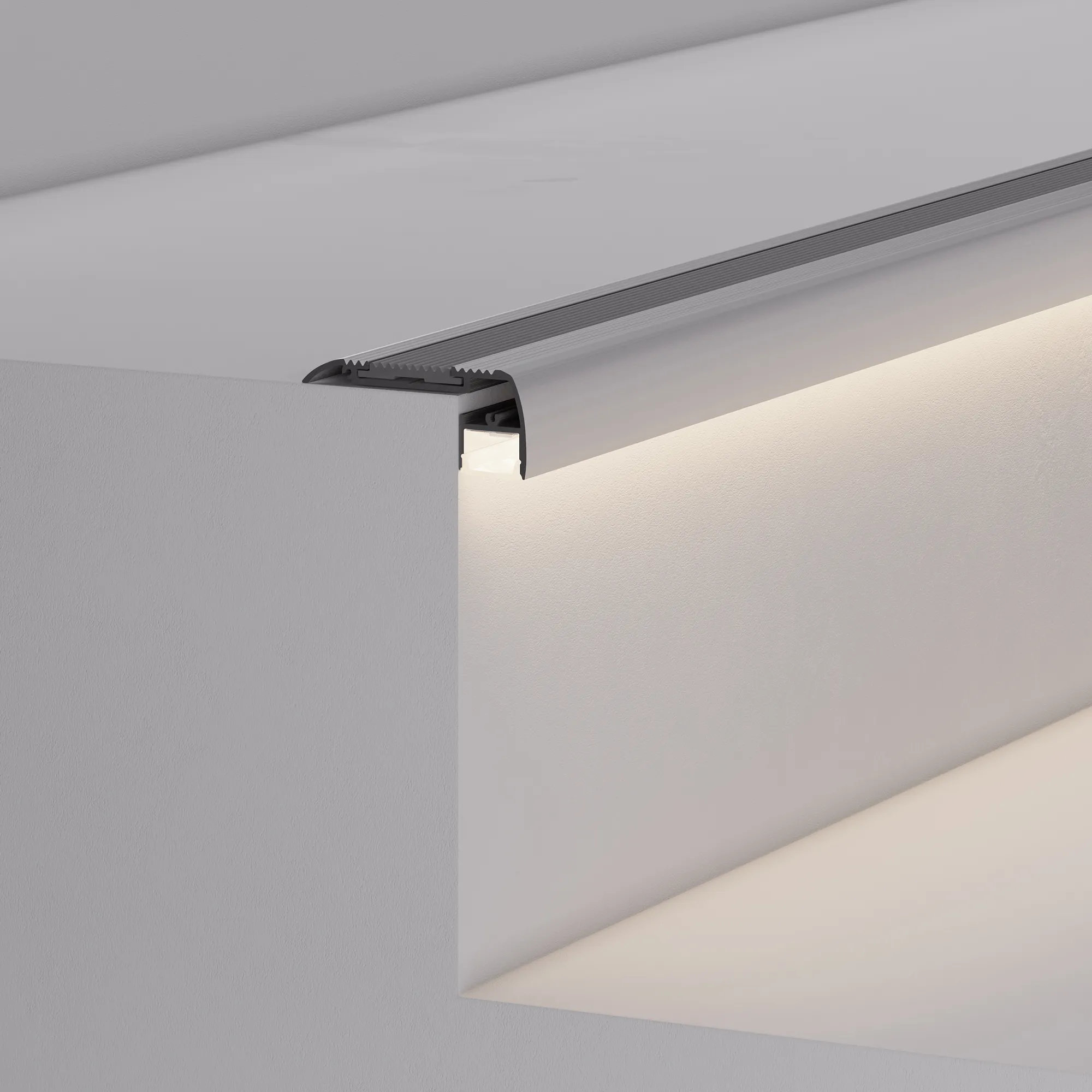 Накладной профиль из анодированного алюминия серебристого цвета для подсветки ступеней с антискользящей вставкой шириной 23,8 мм. Габаритные размеры профиля составляют 2000 мм в длину, 64 мм в ширину и 27 мм в высоту. Площадка для установки светодиодных лент позволяет использовать ленту шириной до 15,5 мм и мощностью до 33 Вт/м. Это обеспечивает гибкость в выборе светодиодных лент и создает потрясающие световые решения. Антискользящая вставка идет в комплекте с профилем.